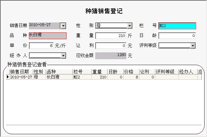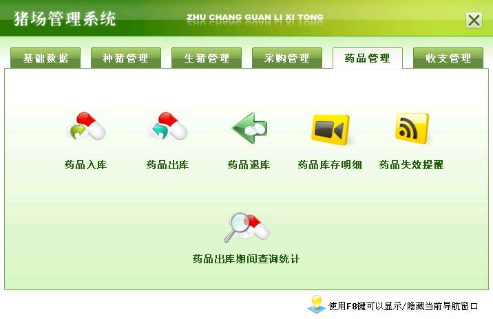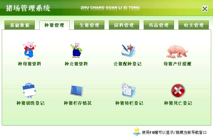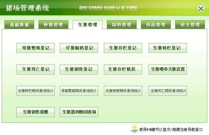 《猪场管理系统》是一套专门针对于现代化养猪场开发的管理软件,适用于大中小型养猪场。该软件包含基础数据、种猪管理、生猪管理、饲料管理、药品管理和收支管理。其中:1、基础数据主要包括品种资料、饲料名称设置、保健免疫设置(仔猪保健免疫设置和母猪保健免疫设置)、客户资料和场内圈舍设置(种猪圈舍设置和生猪圈舍设置);2.种猪管理主要包括种母猪资料、种公猪资料、公猪配种登记、母猪产仔提醒、种猪销售登记、种猪栏存情况、种猪转栏登记和种猪死亡登记;3.生猪管理主要包括母猪繁殖登记、仔猪断奶登记、生猪存栏登记、生猪转栏登记、生猪死亡登记、生猪销售登记、生猪存栏登记、母猪繁殖期间查询统计、生猪销售期间查询统计、生猪死亡期间查询统计、生猪转栏期间查询统计和生猪盈利期间查询;4.饲料管理主要包括饲料入库、饲料出库、饲料退库、饲料库存明细、饲料出库期间查询统计;5.药品管理主要包括药品入库、药品出库、药品退库、药品库存明细、药品失效提醒和药品出库期间查询统计;6.收支管理主要包括其它收入登记、支出登记和期间收入支出查询。 |