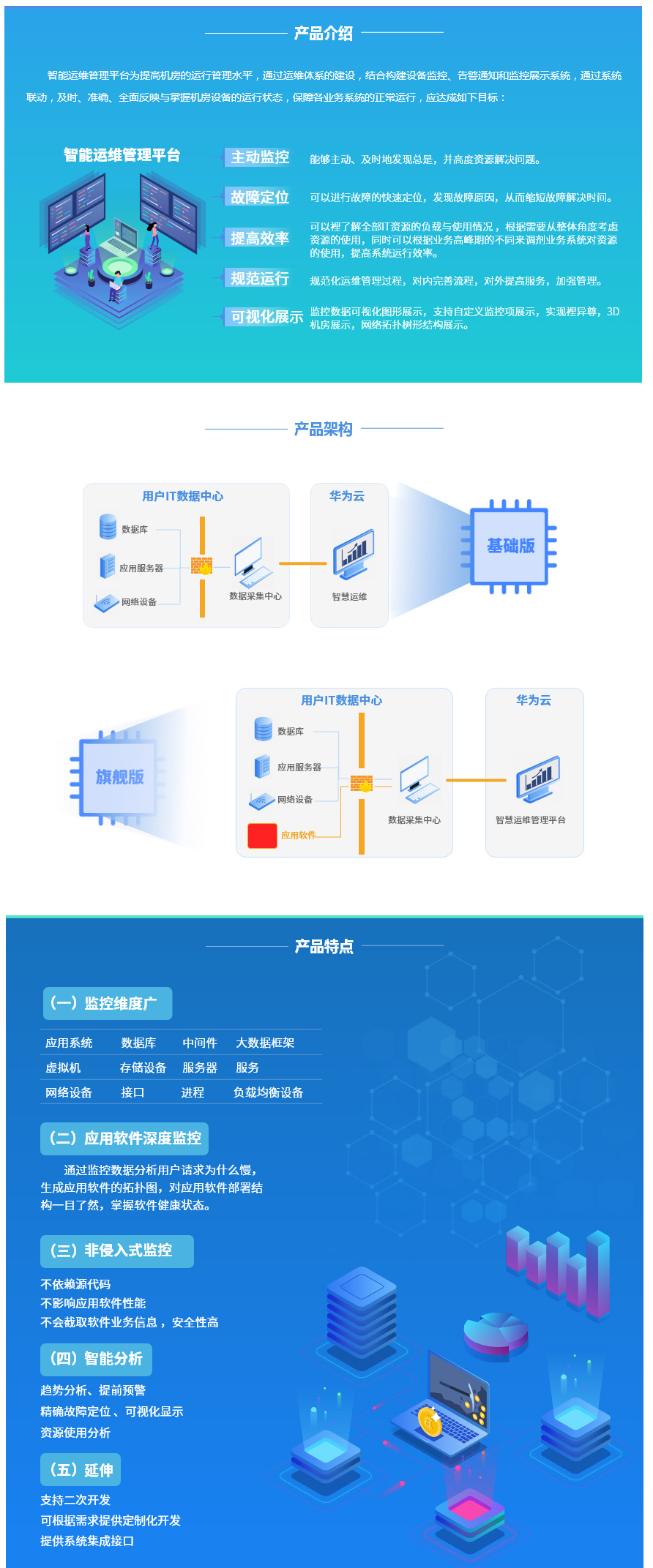 智能运维管理平台是把各种类型的监控对象进行统一集中监控,并将其格式统一规范,并对其有效处理、分析,以直观的界面展现出来,解决系统监控预警、运行维护、故障定位、分析统计等人工开展十分困难的问题。
