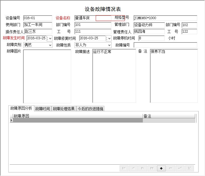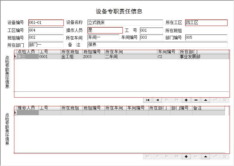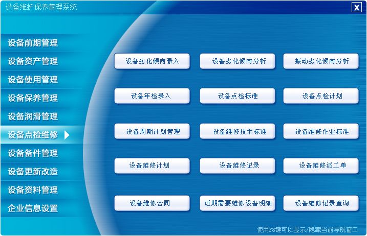 6、设备点检维修管理: 主要包括:设备劣化倾向录入、温度劣化倾向分析、振动劣化倾向分析、设备年检录入、设备点检标准、设备点检计划、设备周期计划、设备维修技术标准、设备维修作业标准、设备维修计划、设备维修记录、近期需要维修设备明细、设备维修派工单、设备维修合同。相关表格可打印输出。