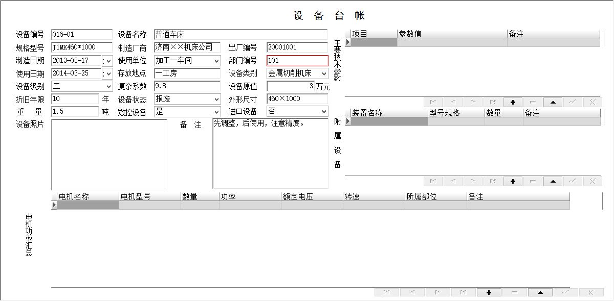 2、设备资产管理: 主要包括:设备台帐、设备分类、设备移装调动、设备闲置。设备报废。设备变动情况六项,各明细记录均可打印输出。