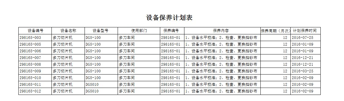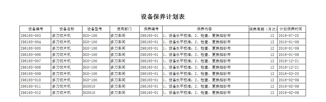 4、设备保养管理: 主要包括:设备保养计划、设备保养记录、本月保养计划、未完成保养清单五项内容,明细列表均可打印输出。