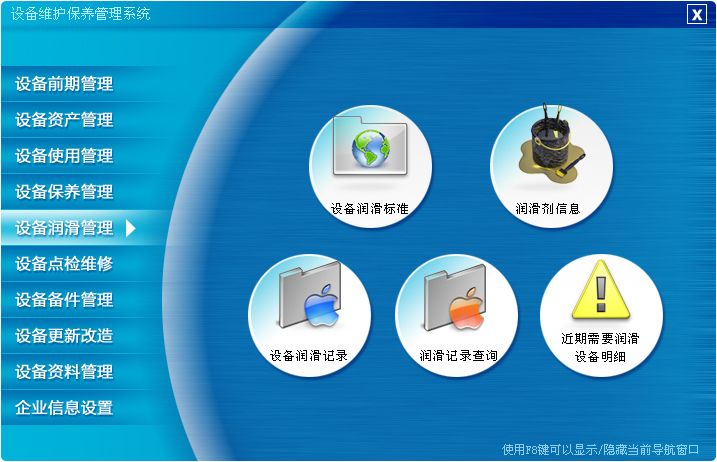 5、设备润滑管理: 主要包括:设备润滑标准、润滑剂信息、设备润滑记录、近期需要润滑设备明细四项内容。