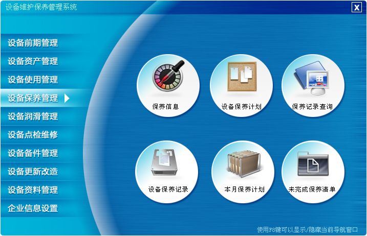 软件简介:《设备维护保养管理系统》是一个包括设备购置、调试、安装、备件及维修保养的管理系统。 系统的主要项目概括为:设备前期管理、设备资产管理、设备使用管理、设备保养管理、设备润滑管理、设备点检维修管理、设备备件管理、设备更新改造、设备资料管理,对设备的状况进行了全面管理,有利于用户了解设备的最新状态,提供工作效率。