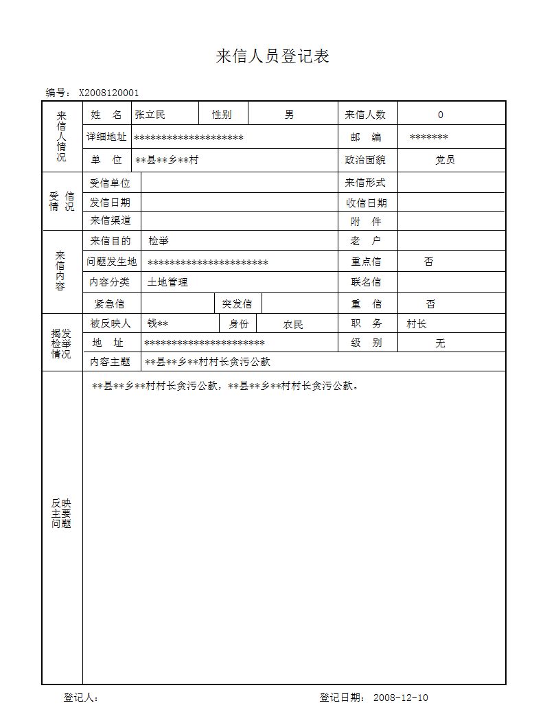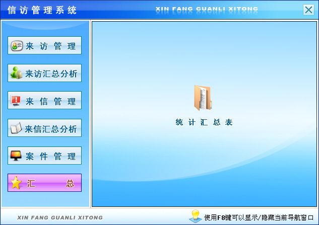 来访管理:(全部,职业,政治面貌,民族,是否越级,经办人,内容分类,汇总分析) 来信管理:(全部,信访目的,职业,职务,政治面貌,民族,内容分类,重信,经办人,汇总分析) 案件管理:(领导批示,上级交办,下级汇报) 汇 总:(汇总表) |