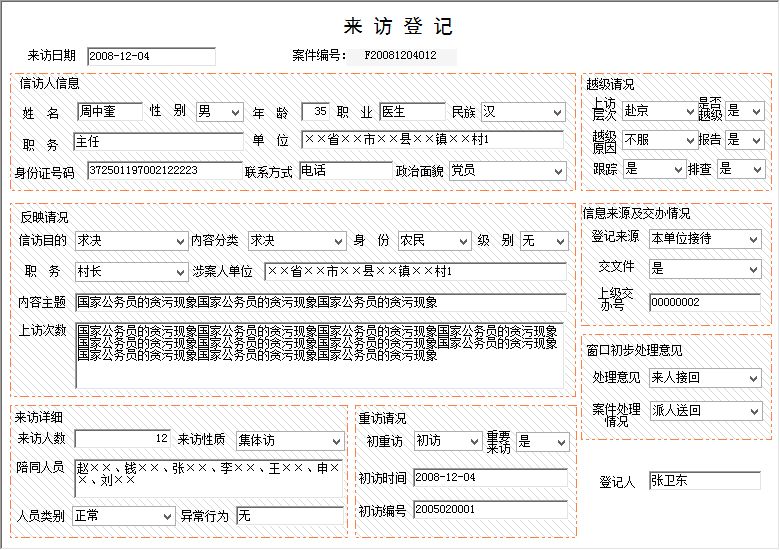 《信访管理系统 》是一套对来访案件管理、来信案件管理、统计汇总和图表分析等进行全面管理的系统。该系统通过采集来访登记、来信登记、领导批示、上级交办和下级汇报等工作过程中的原始数据,进行统计、分析,建立了程序化、制度化、规范化的信访管理系统,可以及时准确地打印出各种报表,更加清晰地呈现出形象化的图形分析,为信访案件管理提供了一个现代化的管理手段,保持了各种数据的完整性、及时性和正确性,完善了管理体系,提高了管理水平。
