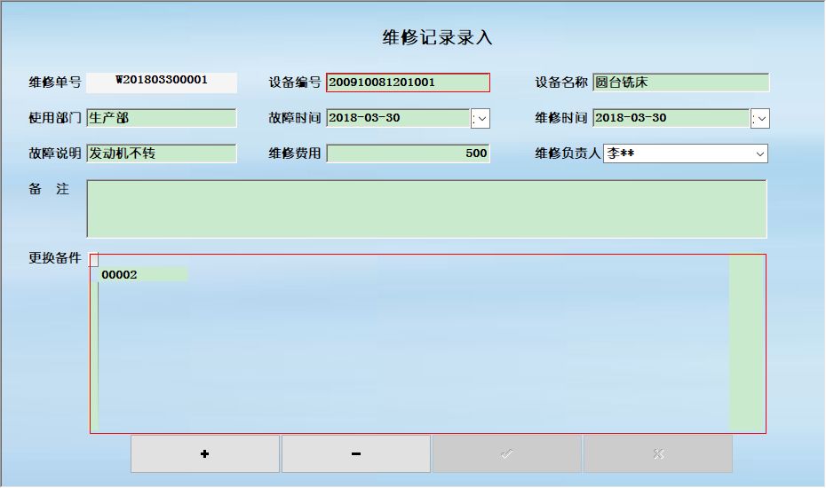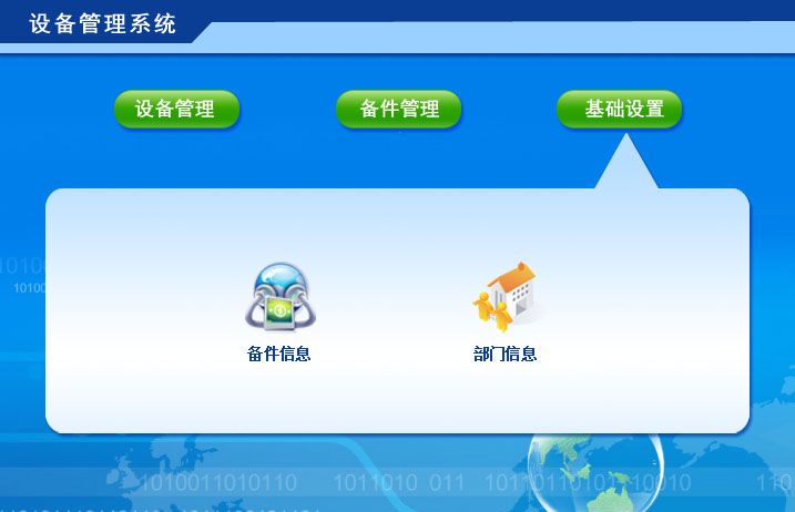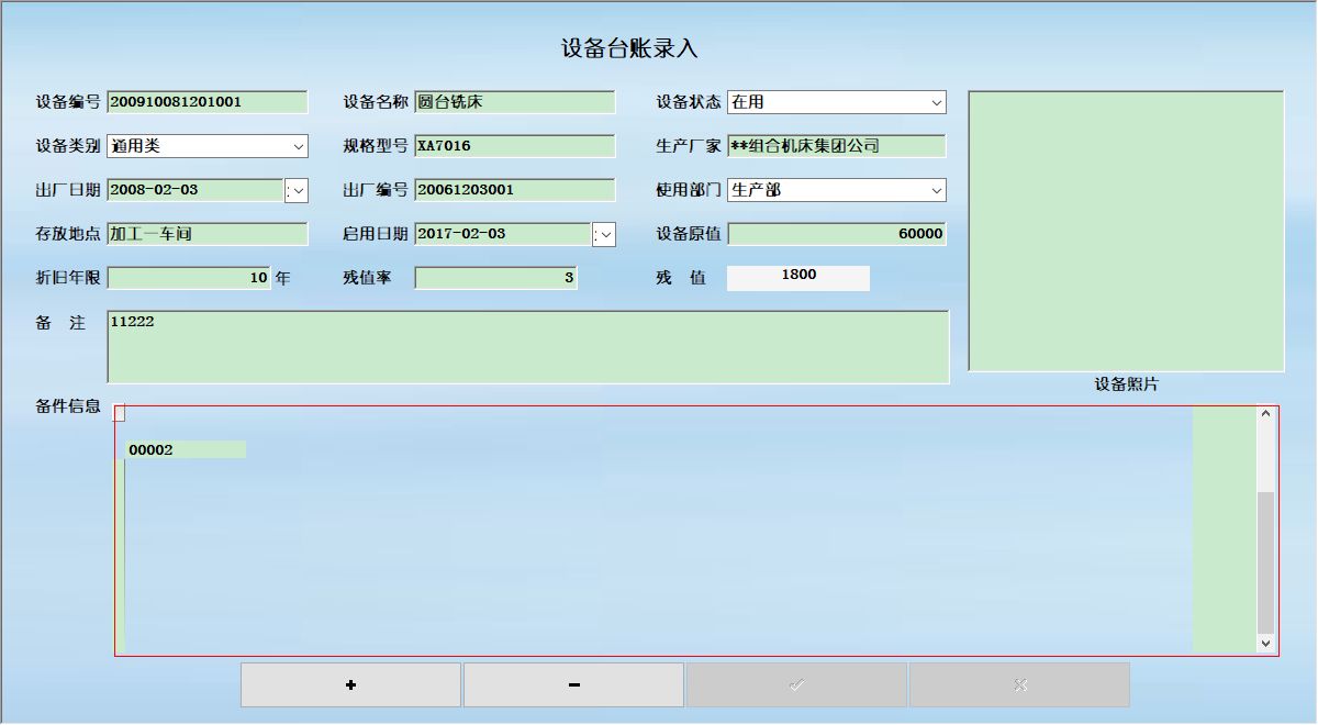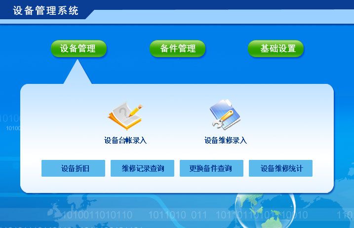 《设备管理系统》是为各企业设备管理而量身定做的管理软件,适用于企业、事业单位等任何需要管理设备的单位。软件主要包括设备管理、备件管理以及基础设置三个模块。强大的管理功能,集数据统计、报表输出、信息交互于一身,具有简单、易用、界面美观的特点,是企业实现高效率管理的得力助手。软件主要功能如下: 1、设备管理(设备台帐录入、设备维修录入、设置折旧、维修记录查询、更换备件查询和设备维修统计); 2、备件管理(备件入库、备件库存); 3、基础设置(备件信息、部门信息)。