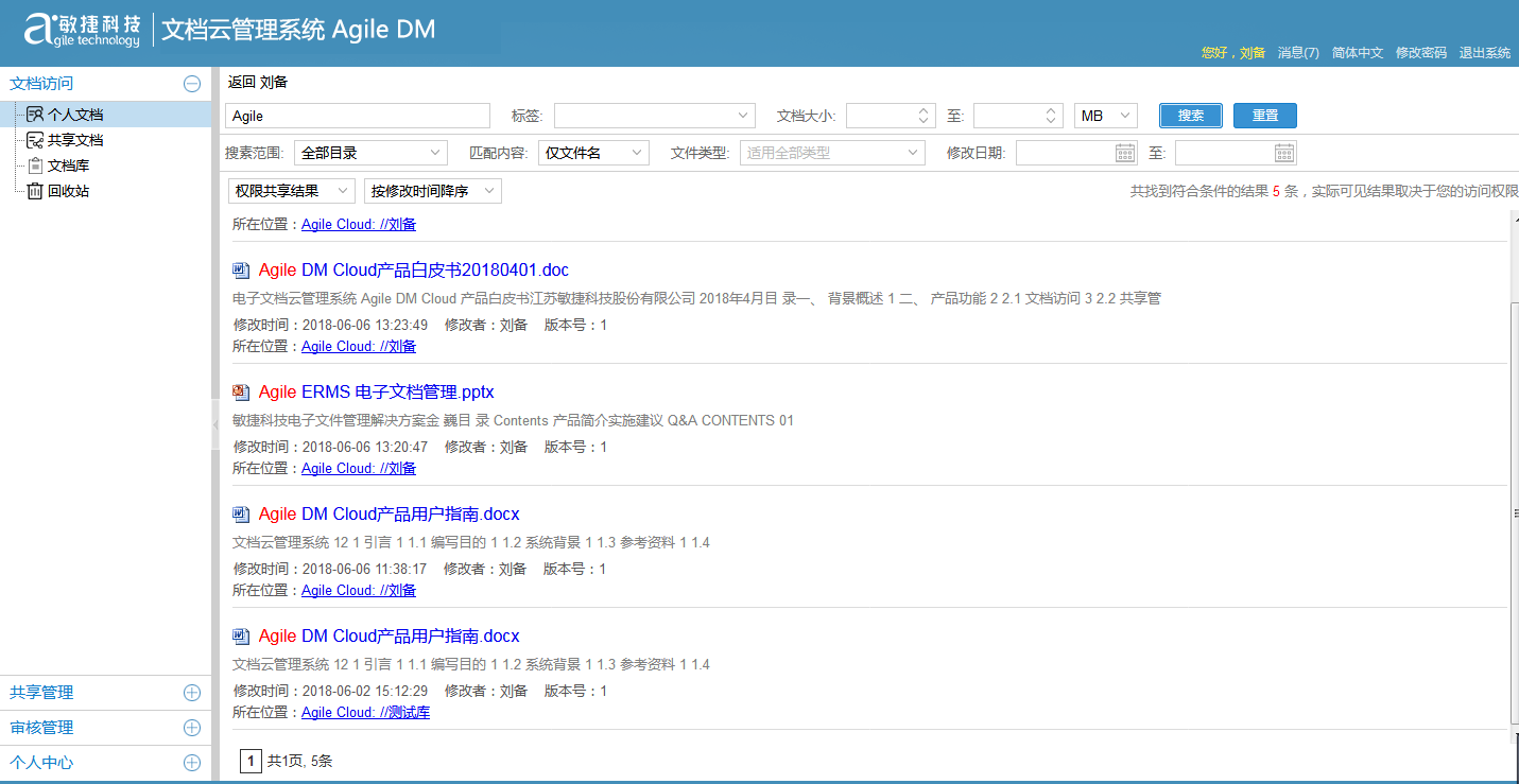 Agile DM Cloud作为文档管理系统,为企业搭建了一个电子文档集中管理的资源平台,文档管理模块包括:文档库、个人文档、共享文档、外链共享、全文检索、版本管理、评论、评分、标签、细粒度文档权限管控、在线预览、在线编辑、系统安全审计等功能。满足企业日常文档管理中的各种需求,能够极大的提升员工工作效率、提高文档安全性和利用率。