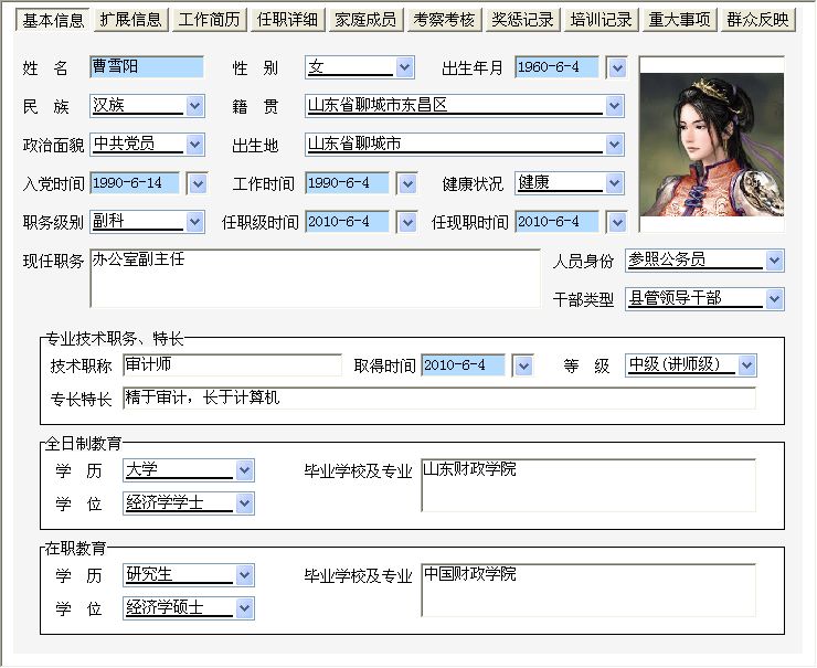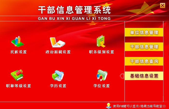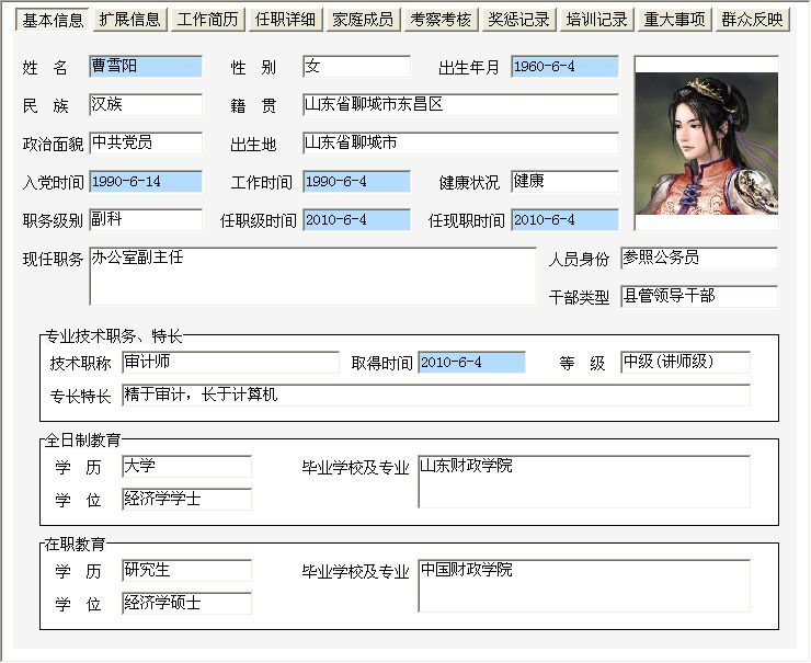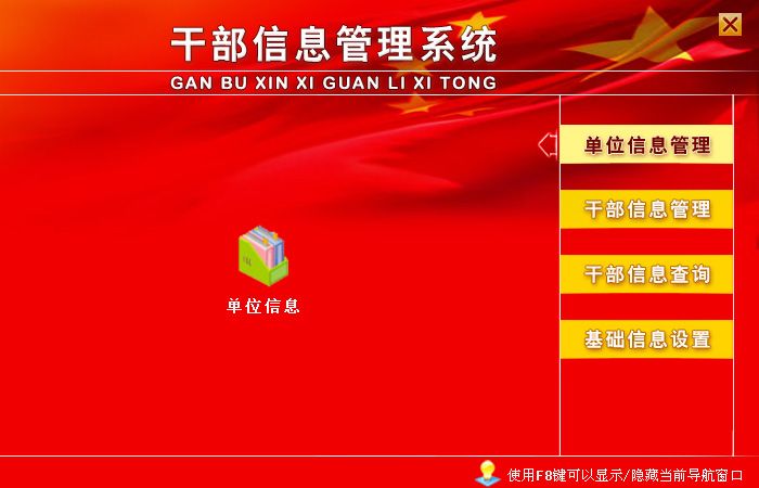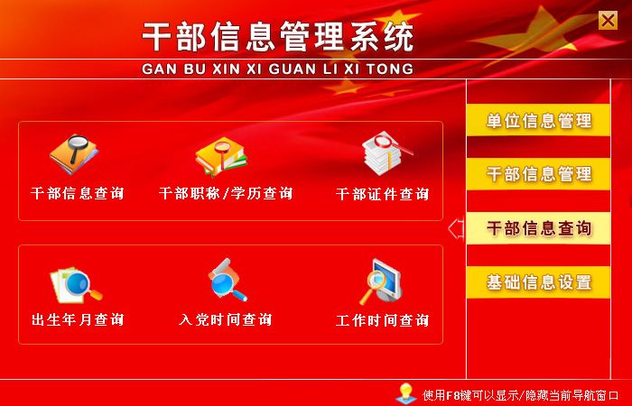 《干部信息管理系统》是一款管理干部信息的系统,本系统适应各级组织人事部门、机关及企事业单位对干部职工资料进行信息化管理,可替代传统手工操作,人员资料查阅、相关表格的生成和输出等项工作中,方便、快速、准确,是提高干部职工信息资料管理的有效手段。系统主要功能有:单位信息管理(单位信息登记)、干部信息管理(干部信息登记)、干部信息查询(按干部信息,职称/学历,证件以及出生年月、入党时间、工作时间等期间查询)、基础信息设置(民族设置,政治面貌设置,职务级别设置,职称等级设置,学历设置,学位设置)