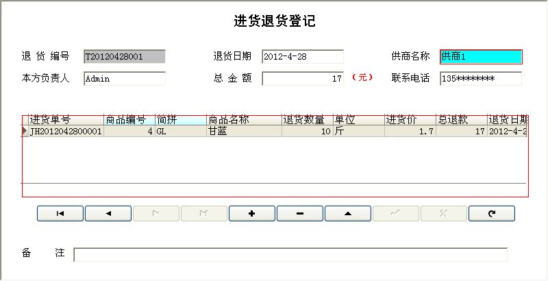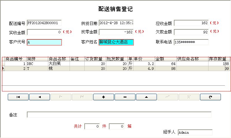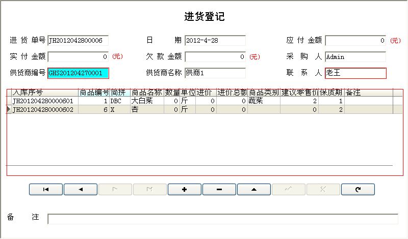 2.0版本和1.0版本的区别: 基本信息: 1、员工信息中增加基础工资信息,包括基本工资,岗位工资,补助金额和晋升并重新设置录入窗口。 2、客户信息中主表中增加客户代号,重新设置录入窗口。 3、客户信息中增加了从表“客户加价明细”。客户加价明细中包括:商品编号、简拼、商品名称、单位、商品类别、加价金额、建议 零售 价、最新售价;其中最新售价是不同客户的加价金额和建议零售价之和;此设置可以解决在配送中出现的不同的客户的配送价格不同的问题,这里的建议零售价是在进货明细中自动提取的当前系统中每种蔬菜的最新的建议零售价格。 4、商品信息中增加简拼和上限库存和下限库存。 进货管理: 1、在进货明细中增加简拼和建议零售价。 2、商品的保质期修改为按天计算,并实现过期提醒。 3、在进货明细中设置了按商品编号和简拼来进行的辅助录入。 4、在进货管理中增加了“进货退货登记”,包括:进货退货信息表和进货退货明细表,进货退货明细表中商品信息的录入也设置了针 对商 品编号和简拼的辅助录入; 5、对更新库存的语句重新做了整理。 销售管理: 1、配送销售登记中在主表中增加了客户代号,并设置了相关的辅助录入。 2、从表可以根据主表中填写的客户的信息自动报出给该客户所配送的蔬菜的相应的最新的价格。 3、在从表中增加了订货数量,并设计”订货信息报表“。 4、对配送销售的报表重新进行了设计。 5、配送客户退货登记:在从表同样设置了针对商品编号和简拼的辅助录入,去除了对退货数量的限制。 6、零售登记中增加了针对商品编号和简拼的辅助录入,同时增加了共计几件几箱的字段。 7、对更新库存的语句重新做了整理。 库存管理: 1、缺货商品和库存明细中中增加了简拼; 2、在库存管理中增加”采购单“、”库存上限提醒“、”库存下限提醒“、”商品过期提醒“。 3、采购单是根据每一种商品的订货的数量和库存的数量的相比较,对库存中不足的进行筛选,生成相应的采购单。 综合查询: 1、增加历史进价的查询; 财务管理: 1、付款登记中的付供货商欠款登记和配送客户付欠款登记都在原来的功能上修改为可以根据入库货配送单号进行分笔的付款。 2、对付供货商欠款登记和配送客户付欠款登记的报表重新做了设计。 3、供货商欠款统计和配送客户欠款统计重新做了统计。 4、零售盈利重新进行了语句的编写。 5、批发盈利重新进行了语句的编写。 6、增加了资金的借入和借出。包括:资金的借入和借出、借入资金查看、借出资金查看、按姓名查询往来账目。并针对其设置了相应的报表。 7、增加了“盈亏盘点” 8、增加了员工工资管理。包括:设置年月、工资管理;并设置了报表。 9、增加了成本管理。包括:特别支出、设备管理、设备的维修和保养。 10、增加了单据管理。 如有任何问题敬请联系!联系电话:(0635)8386265、8386255 |