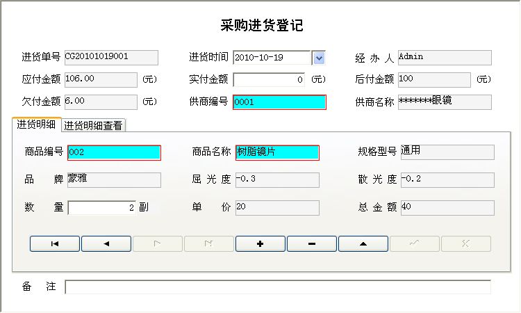软件在功能方面主要包括: 基本信息:商品信息、供商信息、员工信息; 采购管理:采购进货、采购退货、付供商欠款登记、采购进货期间查询、采购退货期间查询、供商欠款查看; 出库管理:客户配镜、报损登记、客户配镜期间查询、报损登记期间查询、销售盈利; 库存管理:库存、底限设置、库存预警; 会员管理:会员信息、积分兑换。 网站提供免费的下载试用,详细的可以到:http://www.inmis.com查看;该软件购买之后将提供升级,技术支持,售后服务。我们的服务理念是:专业、及时、真诚。如有任何问题欢迎联系我们:联系电话:0635-8386265(销售部)0635-8386255-822(技术部)。 |