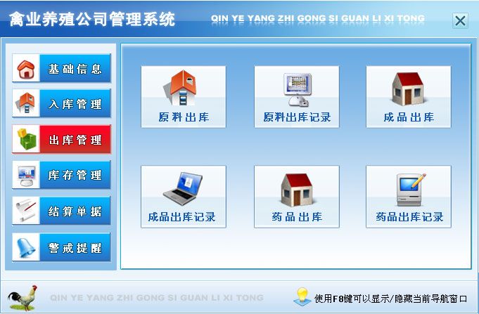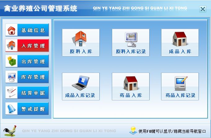 《禽业养殖公司管理系统》是一款适用于家禽业养殖公司日常管理的软件。主要分为:基础信息、入库管理、出库管理、库存管理、结算管理和警戒提醒六个部分内容。其中基础信息主要包括(客户登记、客户查询、原料库存设置、成品库存设置、药品库存设置)几部分。入库管理主要包括(原料入库、原料入库记录、成品入库、成品入库记录、药品入库、药品入库记录)几部分。出库管理主要包括(原料出库、原料出库记录、成品出库、成品出库记录、药品出库、药品出库记录)几部分。库存管理主要包括(原料库存、成品库存、药品库存)几部分。结算单据主要包括(欠条登记、计算登记、结算查看)几部分。警戒提醒主要包括(原料警告、成品警告、药品警告)。该系统界面直观、操作简单、方便,让您对养殖户的档案信息和用料情况一目了然。简单明了的警戒提醒,让您时时把握仓库中原料、成品、药品的情况。依托系统强大的辅助录入和计算功能,减少了录入和收费统计的工作量,提高了工作效率。原料、成品、药品等出入库报表打印,免去了手工填写的烦琐工作。减轻了禽业公司管理部门管理的工作量,提高了禽业管理的效率。满足了禽业仓库财务管理部门日常管理的要求。该系统提供更方便的操作、更合理的功能设置、更强大的数据查询功能,更有体贴的客户服务,倾力打造最优质的禽业养殖公司管理软件;软件分单机版和网络版,方便不同客户的需求。欢迎下载试用!如有任何问题敬请联系! 联系电话:0635-8386265(销售部) |