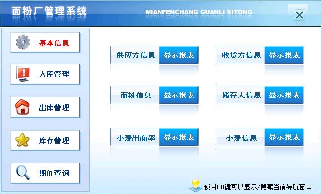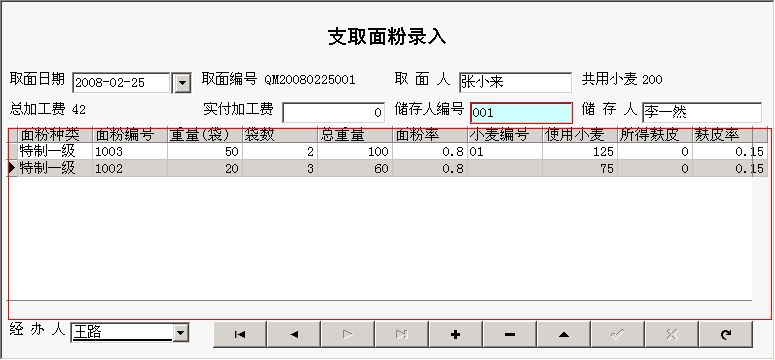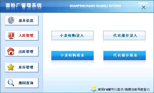 《面粉厂管理系统》在功能方面主要包括:基本信息(供应方信息、收货方信息、面粉信息、储存人信息、小麦出面率、小麦信息)入库管理(小麦收购、代农储存)出库管理(面粉销售、支取面粉、小麦出库)库存管理(小麦库存、面粉库存、个人库存、小麦短线库存、小麦超储库存、面粉短线库存、面粉超储库存)期间查询(收购期间查询、储存期间查询)。