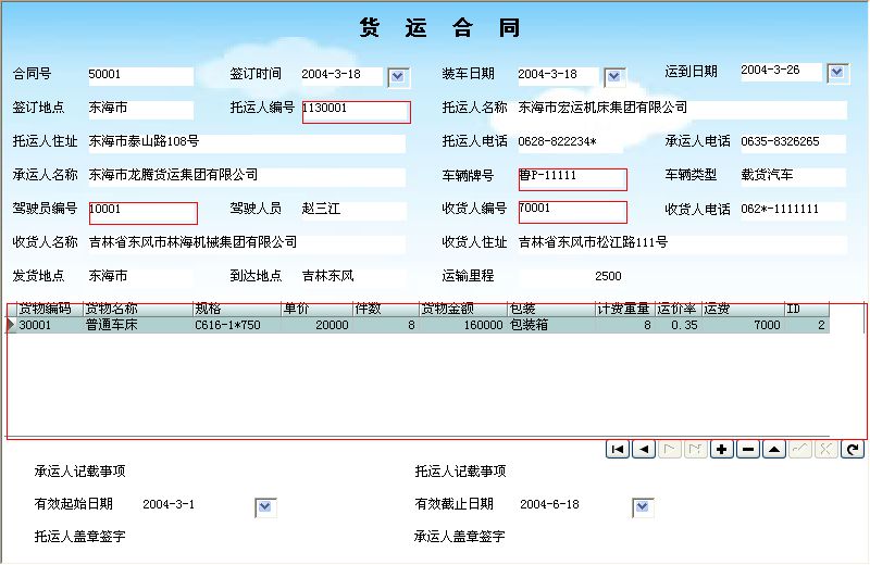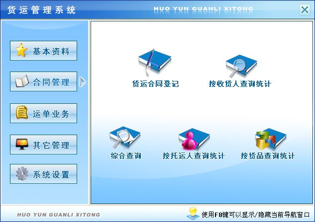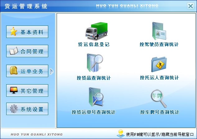 《货运管理系统》是一套对收货人档案;车辆档案;驾驶员档案;托运人档案;员工档案;货品信息;货运合同;运单业务;交通事故管理;驾驶员违章登记、查询进行全面管理的系统。通过简单录入一些基础数据,可以方便地进行自动处理,查询统计汇总功能强大方便快捷。可以对合同按收货人查询统计、综合查询、按托运人查询统计、按货品查询统计;可以对货运业务按驾驶员查询统计、按货品查询统计、按托运人查询统计、按货运单号查询统计、按车牌号查询统计。使经营管理人员及时了解货运信息。 该系统集信息采集、分类、汇总、分析、查询、统计等各种处理为一体,各种操作既可以通过菜单进行,又可以通过系统的管理树导航进行。信息分类全面,树形管理方便,操作快捷简单,系统配有操作演示、业务帮助指导、图文并茂、全中文操作界面,无需计算机专业知识,使用易懂易会。