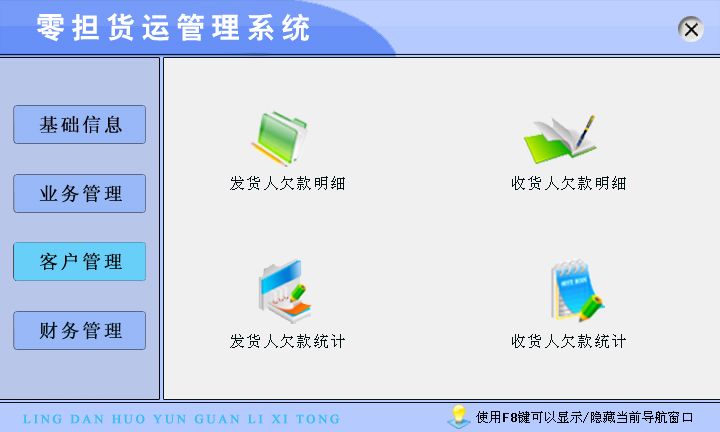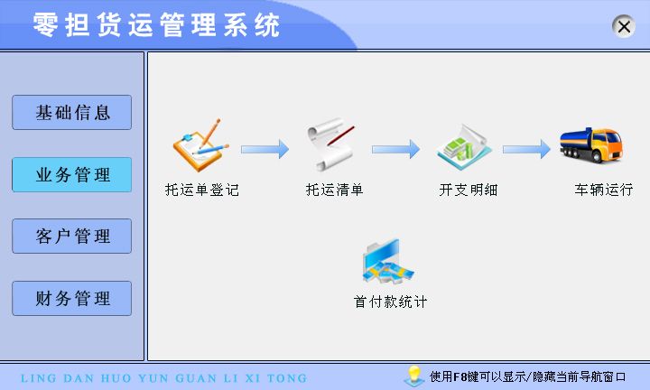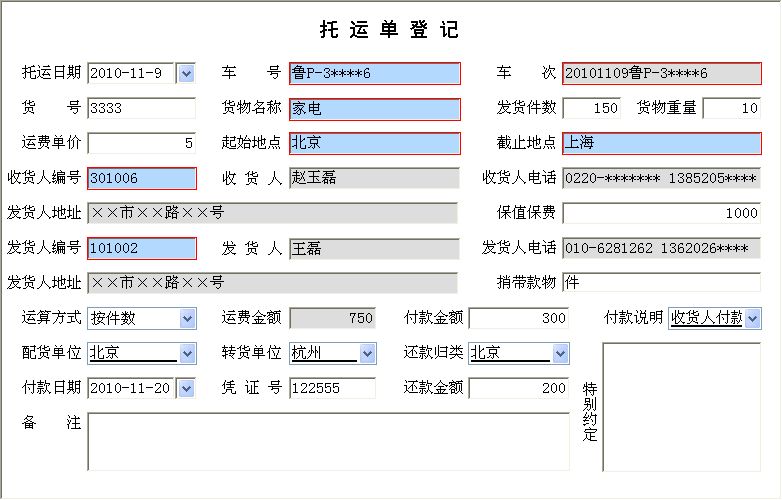 《零担货运管理系统》主要是针对从事零担业务的运输企业对公司的日常业务进行管理的一款软件,它包括了基础信息、托运管理、车辆运行管理、客户管理、工资管理、财务管理。其中基础信息包括(公司信息,车辆档案,员工信息,发货人信息、收货人信息)、托运管理包括(托运单登记、托运清单、首付款统计)、车辆运行管理包括(开支明细、车辆运行情况)、客户管理包括(发货人欠款明细、收化人欠款明细、发货人欠款统计、收货人欠款统计)、工资管理包括(支出登记、员工工资明细、员工工资统计)、财务管理包括(收支帐(收支帐、收支帐结存、期间收支帐)、总支出汇总、现金统计))。系统提供了各种管理的报表功能;是协助各货运公司合理和优化管理的好帮手!