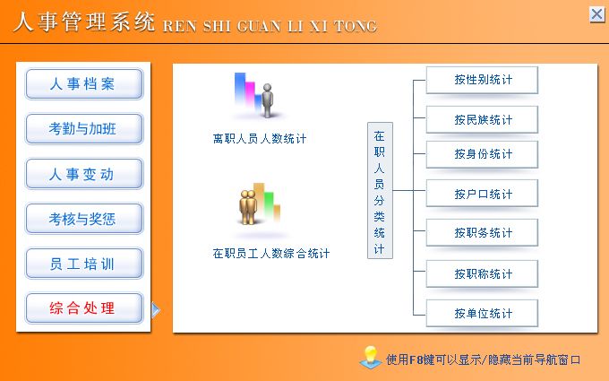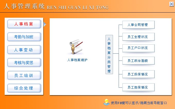 《人事管理系统》是协助各单位科学、全面、高效地进行人事管理的系统。该系统在功能方面包括了:人事档案(人事档案完整资料、人事合同管理、员工生理状况、员工户口状况、员工政治面貌、员工投保情况、员工担保情况)、考勤与加班(考勤、加班、出差记录);人事变动(新进员工登记、员工离职登记、人事变更记录);考核与奖惩(考核与奖惩记录);员工培训(员工培训记录、员工学历记录);综合处理(在职人员分类统计、离职人员人数统计、员工综合统计)以上功能。