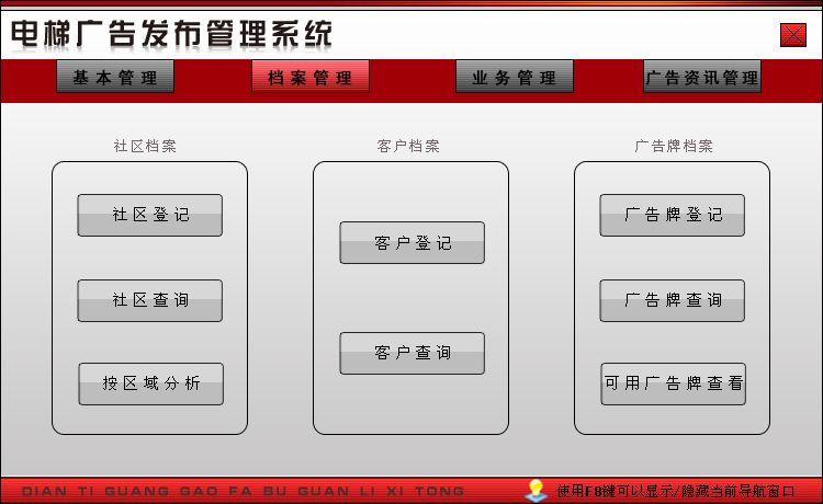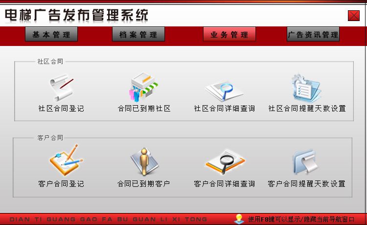 软件在功能方面包括: 1.基本管理:业务员登记、运营支出登记; 2.档案管理:社区档案(社区登记、社区查询、按区域分析)、客户档案(客户登记、客户查询)、广告牌档案(广告牌登记、广告牌查询、可用广告牌查看); 3.业务管理:社区合同管理(社区合同登记、合同已到期社区、社区合同详细查询、社区合同提醒天数设置、社区合同到期提醒)、客户合同管理(客户合同登记、合同已到期客户、客户合同详细查询、客户合同提醒天数设置、客户合同到期提醒); 4.广告资讯管理:广告资讯登记、广告资讯查询、广告资讯分析等四个大模块。 |