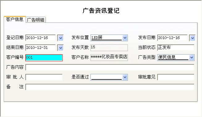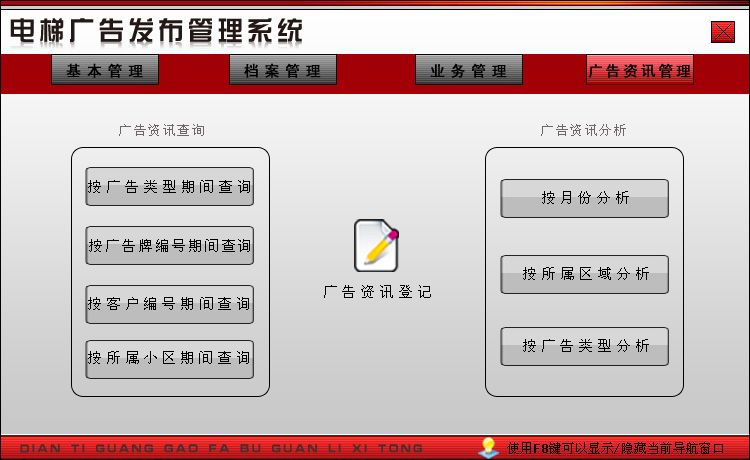 《电梯广告发布管理系统》是一款专门针对电梯广告发布开发的软件,适用于各电梯广告公司、广告公司等。涵盖了基本管理、档案管理、业务管理、广告资讯管理等功能于一身,实现了系统界面图形化,简洁优美,操作直观简单,无需专门培训即可操作使用。便捷的辅助录入,清晰的录入输出窗口,自动计算等减少了工作量,让您的工作更加轻松有趣!