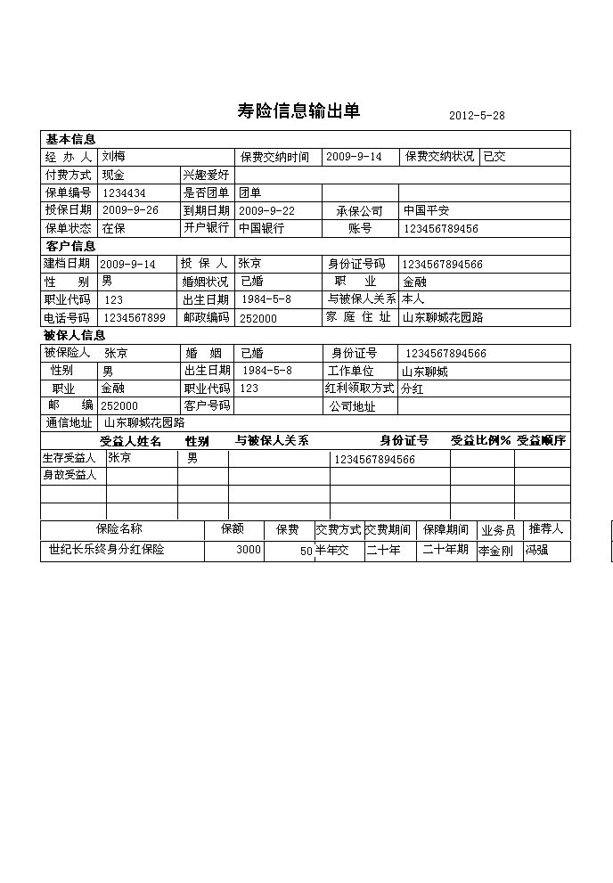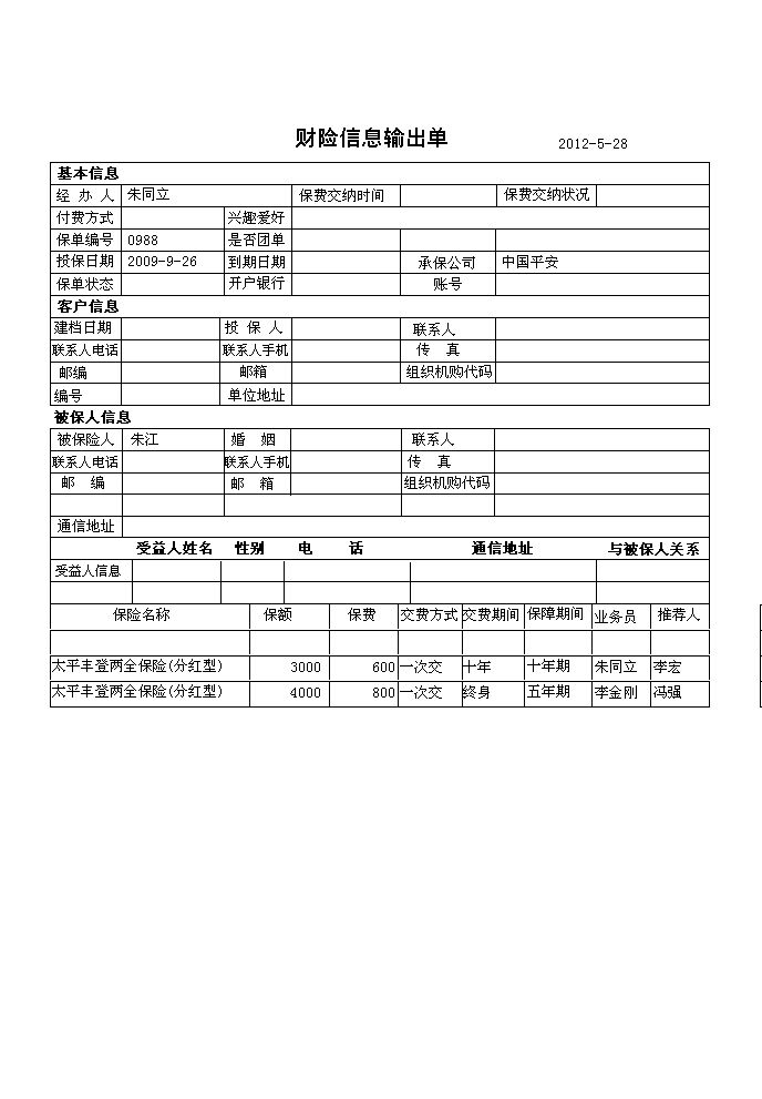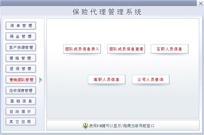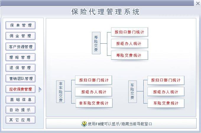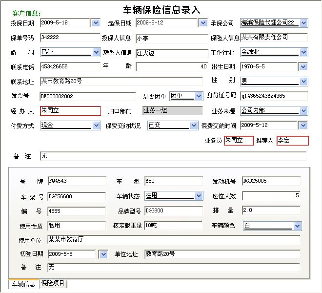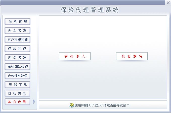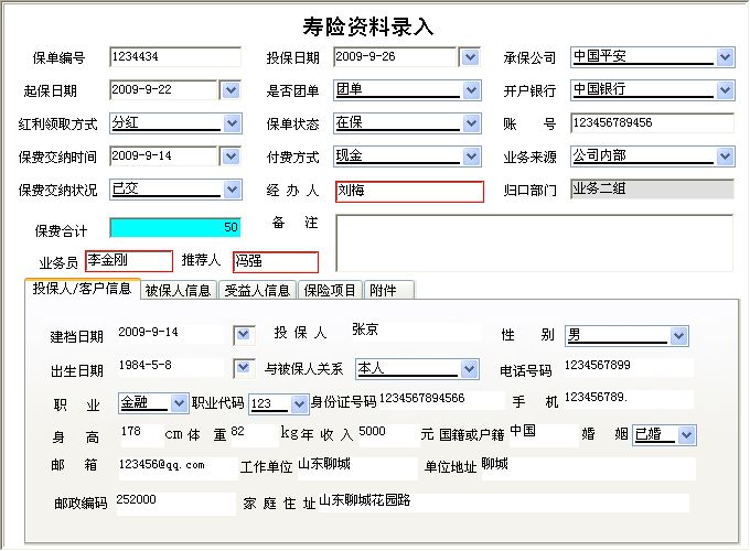 《保险代理管理系统》提供了保险代理人基本信息(保险期间、附加险、缴费方式、联系人状态、与投保人关系、主险、归口部门(小组);提醒(提醒功能是本次升级所加进去的,保单提醒:提醒即将到期的保单,生日提醒:提前一个月提醒被保险人生日);营销团队管理(团队成员信息的输入与输出,在职人员信息查看,离职人员信息查看,公司人员信息查询);保单管理(寿险信息录入与输出,财险信息录入与输出,货运保险的录入与输出,车辆保险信息录入与输出);客户资源管理(财险客户信息查询与输出,寿险客户信息查询与输出,车险客户信息录入与输出);理赔管理(理赔情况的录入与输出,理赔情况查询,某一期间内理赔金额统计,并生成报表);保险资料管理(寿险资料管理,财险材料管理,车队资料管理);保单查询(寿险信息查询,财险信息查询,车险信息查询 并提供报表输出);保费统计(查看在某一期间各归口部门(小组)或个人的业务量,总保额与保费,并提供报表输出。);等进行全面管理的系统。是为保险代理人、经纪人量身开发的一套软件。 |