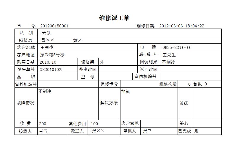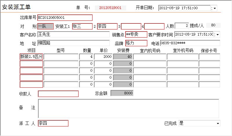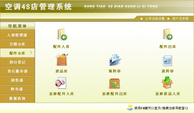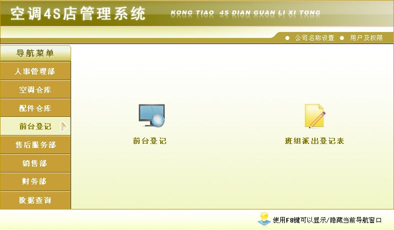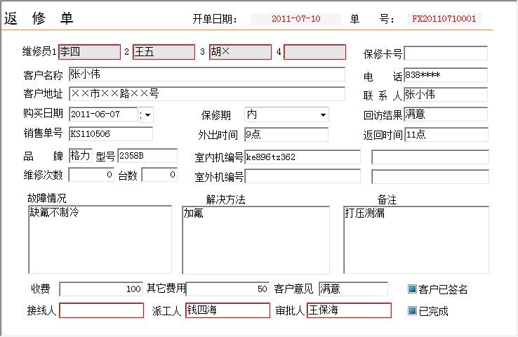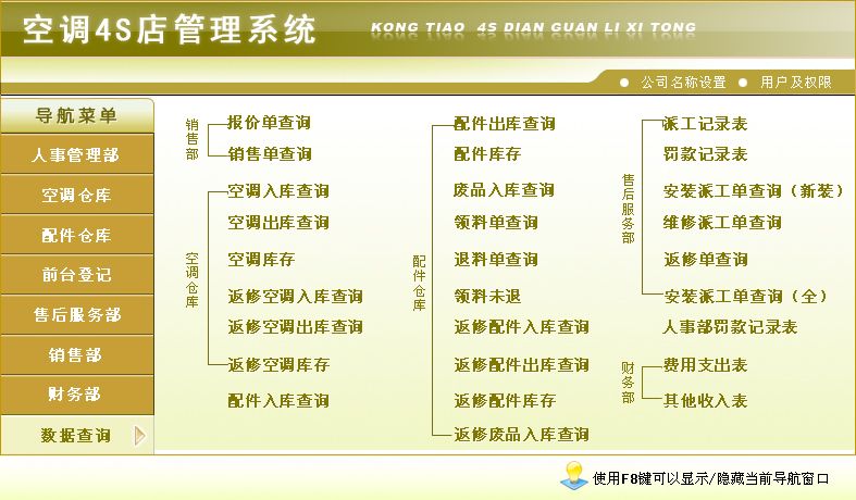 《空调4S店管理系统》软件是一款集空调销售、安装、维修及配件于一体的软件,本公司本着实用、易用、好用的设计理念,造就了高品质的空调4S店管理软件。软件操作简单方便,界面美观大方,可方便地帮助您对空调4S店进行管理,自动统计空调及配件的库存数量,员工工资等。为您大大节省工作时间,提高工作效率。科学的管理方法会给您带来无限的效益,宏达空调4S店管理系统将是您明智的选择。 该系统在功能方面主要包括了:销售部、空调仓库、配件仓库、售后服务部、人事管理部、财务部、前台登记、数据库查询、公司名称设置几部分。其中销售部主要包括:报价单、销售单、空调销售记录、员工销售空调业绩;空调仓库主要包括:空调入库、空调出库、返修空调入库、返修空调出库;配件仓库主要包括:配件入库、配件出库、废品库、领料单、退料单、返修配件入库、返修配件出库、返修废品入库;售后服务部主要包括:班组员工设置表、售后服务部罚款单、安装派工单、维修派工单、返修单;人事管理部主要包括:员工信息、安装项目费用设定、维修提成比例设定、返修提成比例设定、罚款;财务部主要包括:员工工资汇总统计、期间经营情况报表、员工罚款表、售后罚款单、费用支出单、其他收入单;前台登记主要包括:前台登记、维修登记表、班组派出登记表;数据库查询主要包括:销售部(报价单查询、销售单查询)、空调仓库(空调入库查询、空调出库查询、空调库存、返修空调入库查询、返修空调出库查询、返修空调库存)、配件仓库(配件入库查询、配件出库查询、配件库存、废品入库查询、领料单查询、退料单查询、领料未退、返修配件入库查询、返修配件出库查询、返修配件库存、返修废品入库查询)、售后服务部(派工记录表、罚款记录表、安装派工单查询(新装)、维修派工单查询、返修单查询、安装派工单查询(全))、人事部(人事部罚款记录表)、财务部(费用支出表、其他收入表);公司名称设置主要包括:名称设置。软件本着“优质软件、服务大众”的理念,设身处地的为客户着想,为客户提供强大的功能;同时,我们继续本着实用、易用、好用的设计理念,为您奉献更优质的软件产品 —— 界面更加友好,操作更加人性化,使用更加方便,让您的工作更加得心应手;更加完善的空调4S店管理,灵活的功能设置等,让您在使用过程中适合更多使用情况;功能完善,每一报表都可与EXCEL连接,使您在使用过程互相导入导出数据。没有最好产品,只有更好服务,软件提供更方便的操作、更合理的功能设置、更强大的数据查询功能,更有体贴的客户服务,倾力打造最优质的空调4S店管理软件;软件 —— 分单机版和网络版,方便不同客户的需求,让您有更多的选择空间,全方位的空调4S店管理,从空调的入库开始,到空调的出库、安装、维修以及库存的统计与打印,您想到的我们已经为您做到了。因为有您的支持,所以我们才会进步,我们进步了,您将更加满意;只因为我们力求完美,力求使您满意,空调4S店管理软件的每一点成长都离不开您的支持!空调4S店管理软件的每一点进步都有您的功劳!