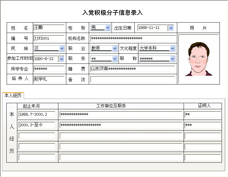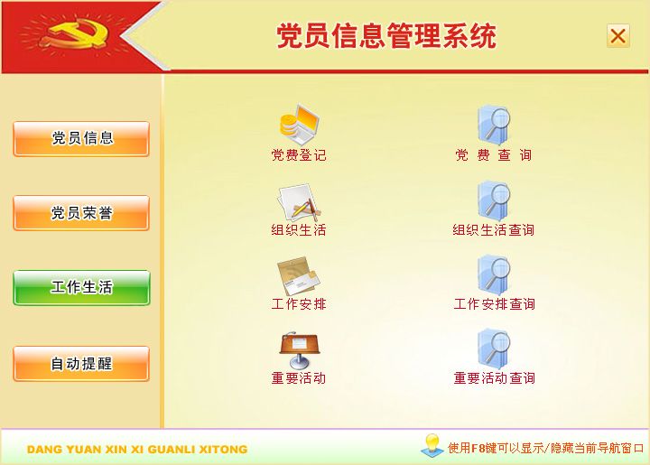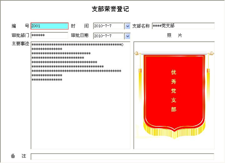 《党员信息管理系统》是为基层党组织专门开发的一套管理系统,通过本系统的应用,规范了基层党支部的建设,提高了信息化管理水平。 系统主要内容包括: 1.党员信息(党员信息录入,入党积极分子,发展党员信息,党员流出登记,党员信息查询) 2.党员荣誉(优秀党员,党员奖惩,支部荣誉登记,荣誉查询,民主评议情况,民主评议查询) 3.工作生活(党费登记,党费查询,组织生活,组织生活查询,工作安排,工作安排查询,重要活动,重要活动查询) 4.自定义事件提醒(党员生日提醒,重要活动提醒)