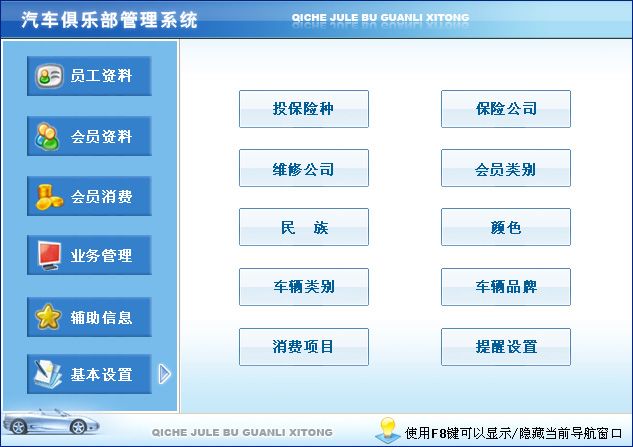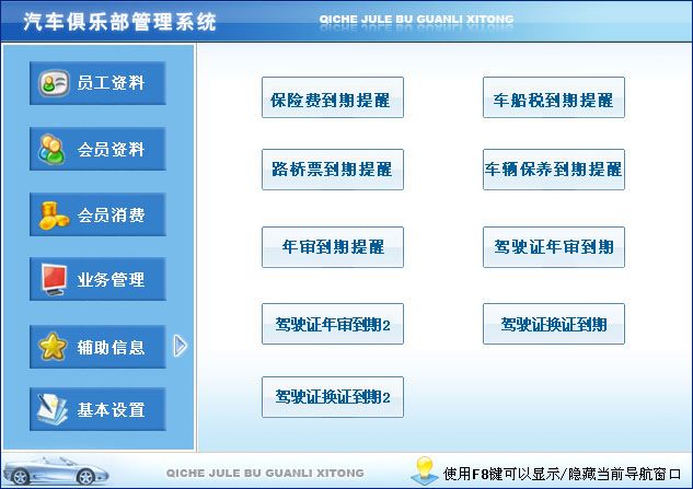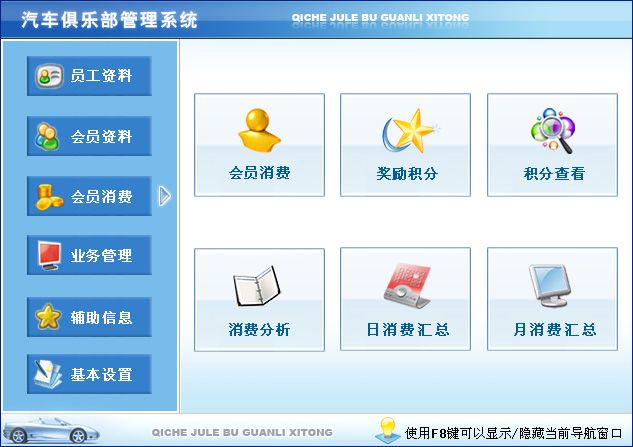 《汽车俱乐部管理系统》是专门针对汽车俱乐部、车友会而开发研制的信息化管理系统,该系统包括员工资料、会员资料、会员消费、业务管理、辅助信息、基本设置六大模块。其中以会员资料和消费资料为主模块,规范的业务管理,实现了系统的全面化管理,是汽车俱乐部管理人员的得力助手。 《汽车俱乐部管理系统》包括以下功能: 基本参数:投保险种、保险公司、维修公司、会员类别、民族、车辆类别、车辆品牌、消费项目、颜色、提醒设置。 会员资料:会员信息、会员充值、卡号禁用、卡号解禁、会员退卡。 会员消费:会员消费、日消费汇总、月消费汇总、消费分析、奖励积分、积分查看。 业务管理:保险登记、理赔登记、车辆年审登记、违法登记、活动登记、会员参加活动、办理优化服务。 辅助信息:保险费到期提醒、年审到期提醒、车船税到期提醒、路桥票到期提醒、车辆保养到期提醒、驾驶证年审到期提醒、驾驶证换证到期提醒、驾驶证年审到期提醒2、驾驶证换证到期提醒2。 员工资料:员工信息、员工管理、员工工资。 此软件具有极强拓展空间,可以根据不同的需求进行调整和修改