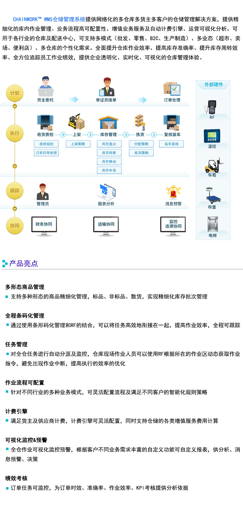 CHAINWORK™ WMS仓储管理系统提供网络化的多仓库多货主多客户的仓储管理解决方案,提供精细化的库内作业管理、业务流程高可配置性、增值业务服务及自动计费引擎、运营可视化分析。