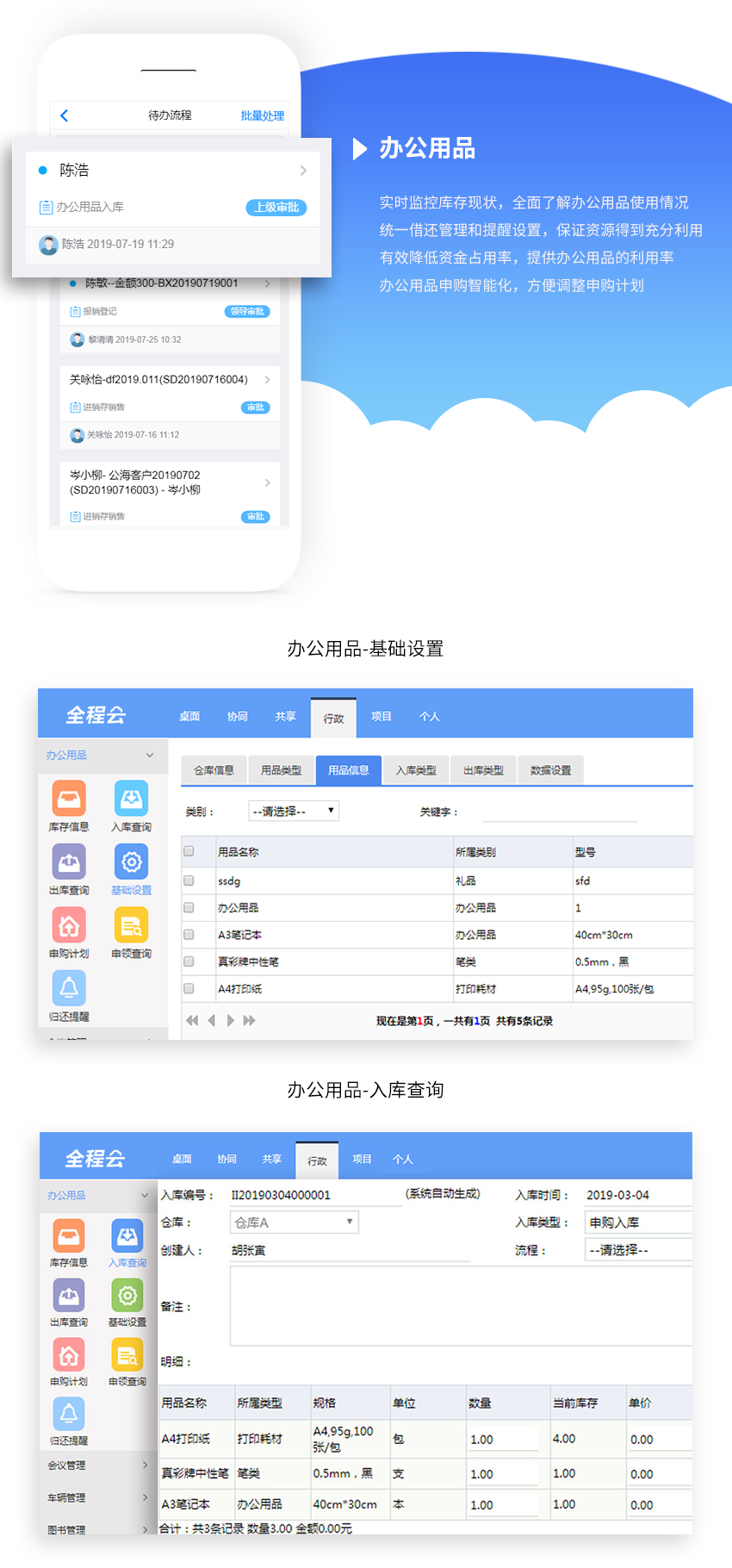 主要功能:工作提醒桌面、档案管理、行政管理、车辆管理、图书管理、办公用品,用品库存管理、费用预算、借款报销、档案管理及相关系统表单流程等。