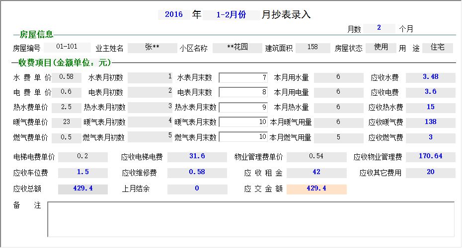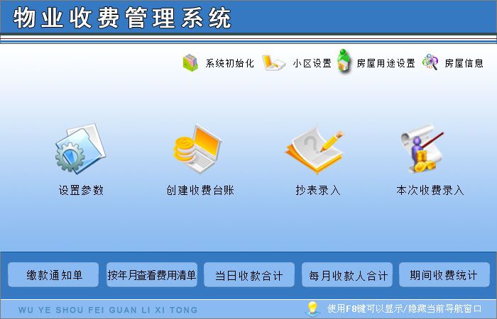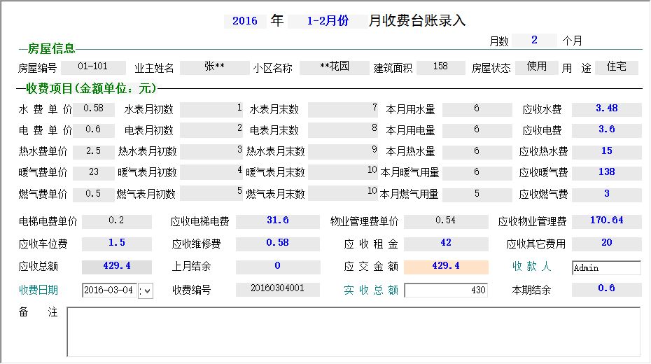 一个协助小区房产物业部门收取业主物业费、电费、水费、燃气费、取暖费、热水费、燃气费、停车费、租金等各项物业费用进行全面管理的系统。通过简单录入房屋基本信息,很方便的把房屋基本信息复制到收费信息中,减少重复录入工作量,强大的数据汇总统计功能,方便快捷地计算出每个业主每个收费周期的各项物业交费汇总情况、小区每项物业费用及汇总情况、商铺和住宅各项费用收费汇总情况情况等。极大的提高工作效率和工作质量。系统灵活易用,上手快,数据处理准确,适合各种小区房产物业收费人员进行收费管理。