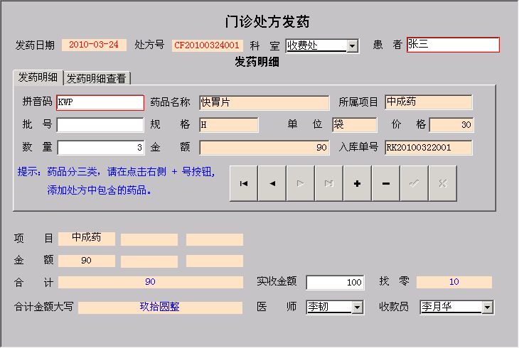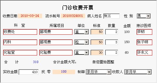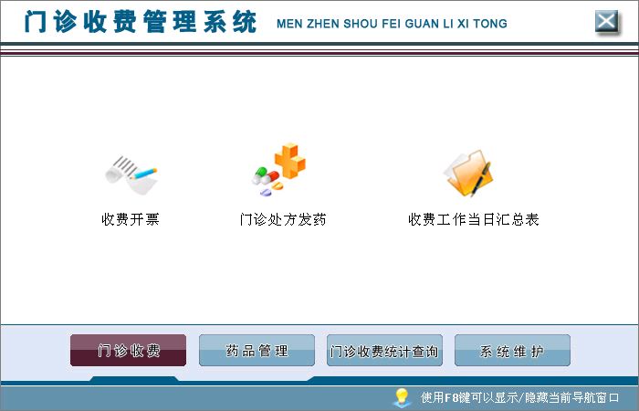 《门诊收费管理系统》是一套对医院门诊的收费开票、门诊处方、药品管理、门诊收费明细统计查询等进行全面管理的系统。该系统包括门诊收费(收费开票、退款);门诊处方(门诊处方发药、收费工作当日汇总表);药品管理(药品入库、药品基本信息设置、药品库存明细);门诊收费明细统计查询(按接诊医师统计查询、按收费名称统计查询、按收款人统计查询、按病人姓名查询)系统维护(期间设置、经办人信息、医师信息、药品单位信息、科室表、门诊费用表)。该系统通过简单录入门诊收费的项目名称以及收费的标准金额、药品入库、经办人信息的基本情况,随时根据门诊处方进行查询;自动计算出药房药品库存明细;通过药品入库,门诊发药,药房的药品减少,可自动统计出药品现在的库存数量,系统会根据药品的警戒高线和警戒底线进行判断,将在超线药品和底线药品的节点上分别显示出来,并能打印输出超线药品、底线药品;自动计算出每个项目收费明细情况;每个收费员收费明细情况;每个病人收费明细情况。分别按项目名称、收款人、病人姓名进行收费明细查询。本软件采用"凭证式"的录入界面,使系统更加直观,使用方便、灵活。系统提供大量的报表,包括发票单据、处方单据以及统计汇总报表等,其中报表也采用凭证式的报表,报表的形式可以根据用户的实际需要进行修改,使系统更加满足您的要求。是协助各医院进行门诊收费全面管理的好帮手。系统配有详细的开发帮助和操作演示,图文并茂,操作易懂易会。为了适应市场经济的发展,使医院职能部门能够准确急时掌握门诊收费、住院收费、药品管理等情况,我们公司专门从不同角度为您开发设计出医院专用多种管理软件,如:《医院管理系统》、《医院门诊收费与住院管理系统》、《医院门诊收费管理系统》等。轻松进行各种医院管理,本公司软件是您的首选