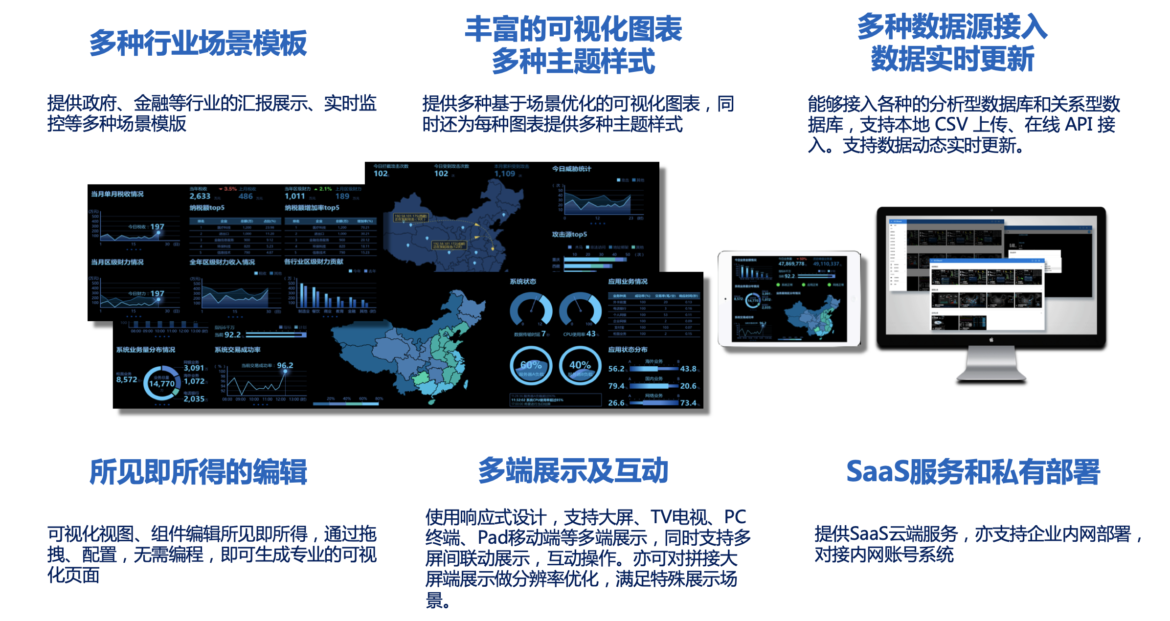 大数据可视化分析平台,为管理决策者提供面向人工智能决策的大数据可视化方案,帮助非专业工程师通过图形化界面轻松搭建专业水准的可视化应用,满足您参观展览、业务监控、风险预警,地理信息分析等多种业务的展示。