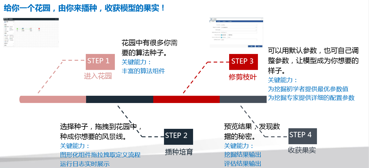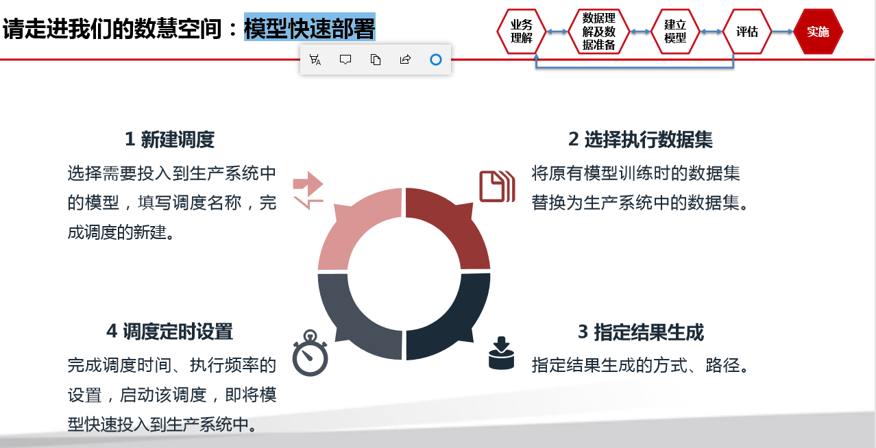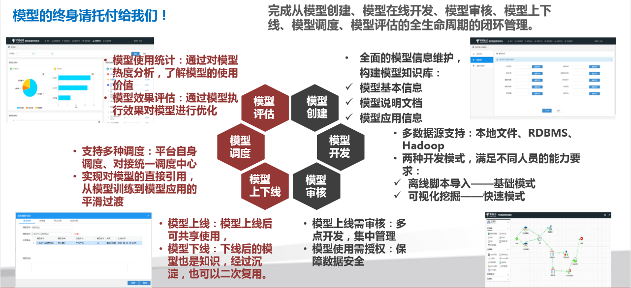 ● 实现一站式的线上数据挖掘及模型闭环管理,提供全程自主配置化的模型开发能力降低模型实现的 门槛,提高模型建设的效率,提升模型的价值和复用性。