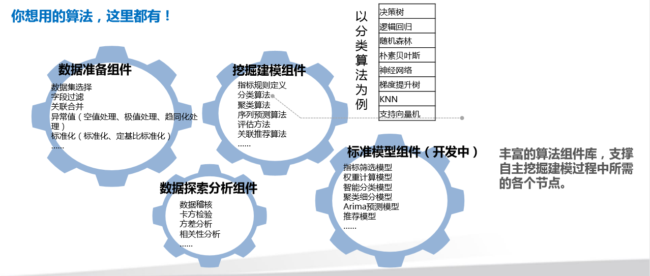 ● 具有丰富的数据处理及数据挖掘算法。满足用户多样化数据挖掘需求。