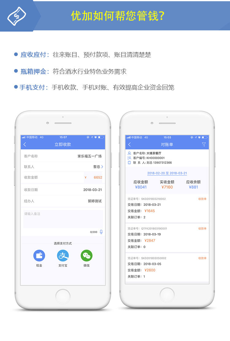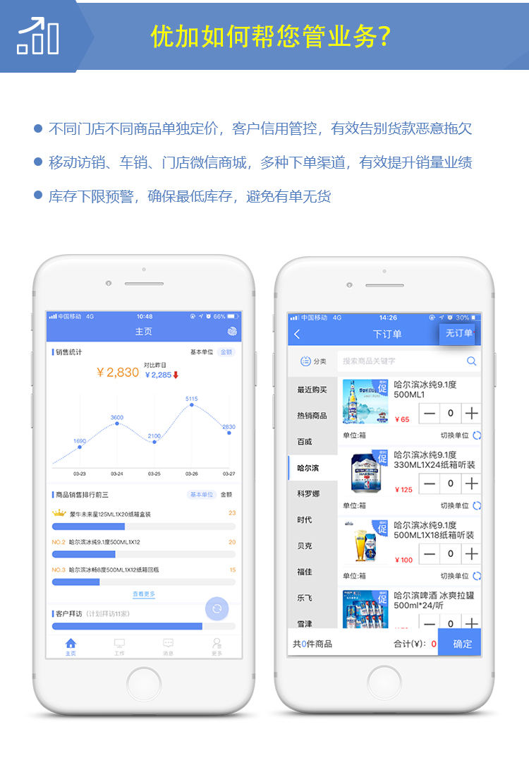 饮料酒水行业特色功能:瓶箱押金、回收瓶箱、条码防窜货管理 功能齐全:包括外勤人员管理、进销存管理、财务资金管理、运输管理、门店微信商城