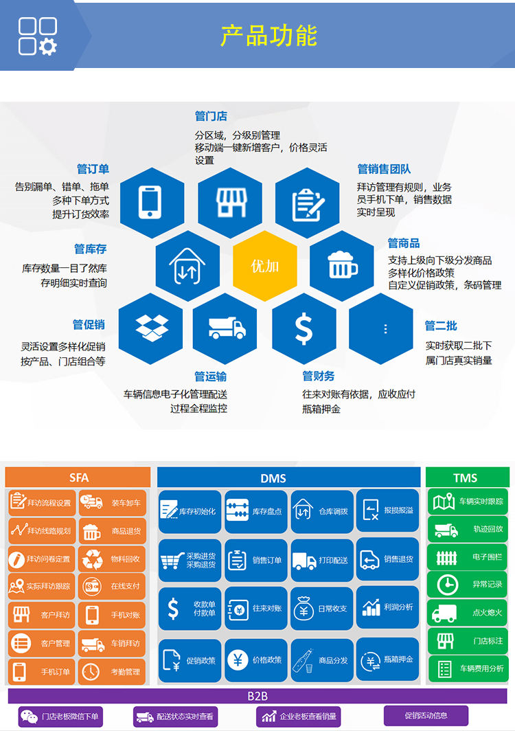 优加云进销存,专为快消行业量身定制,将快销传统业务和移动终端进行有效的传承和融合。集SFA、DMS、TMS、B2B于一体,致力于帮助企业建立一个简捷、高效实时的企业管理平台。