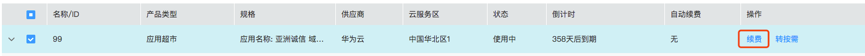8.1. 在费用中心>续费管理中,选择需要续费的订单,续费并提交续费订单。