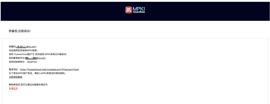 如果该邮箱尚未注册过MPKI系统,系统会默认为该邮箱创建新的账户。账户名即用户邮箱,登录密码即邮箱中初始密码。为了保证用户的MPKI账户安全,建议登录MPKI系统之后请立即修改密码。