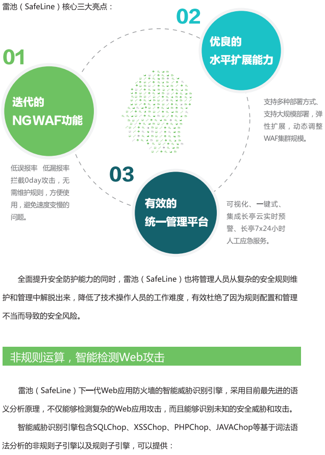 采用非规则语义分析引擎,使用算法模型增强检测精确性(低误报、低漏报);减少规则维护成本,方便易用;同时也避免了规则叠加太多导致速度变慢的问题。