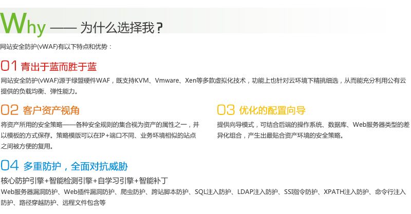 绿盟网站安全防护服务(vWAF),是绿盟科技针对公有云场景,以虚拟化设备形态为核心的安全服务,全面防护企业客户部署在公有云上的Web业务。核心防护引擎、智能检测引擎、自学习引擎、智能补丁,多种防护,全面对抗OWASP Top10威胁。按需购买,方便扩容~
