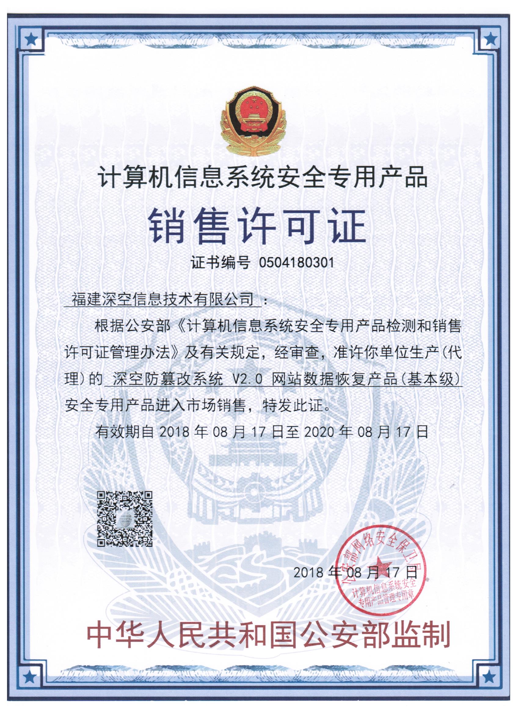 公安部《计算机信息系统安全专用产品销售许可证》