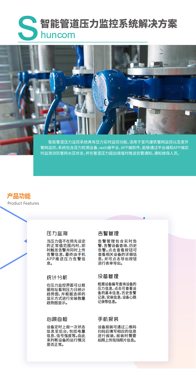 智能管道压力监控系统具有压力实时监控功能,适用于室内建筑管网监控以及室外管网监控。