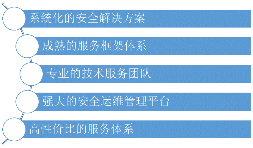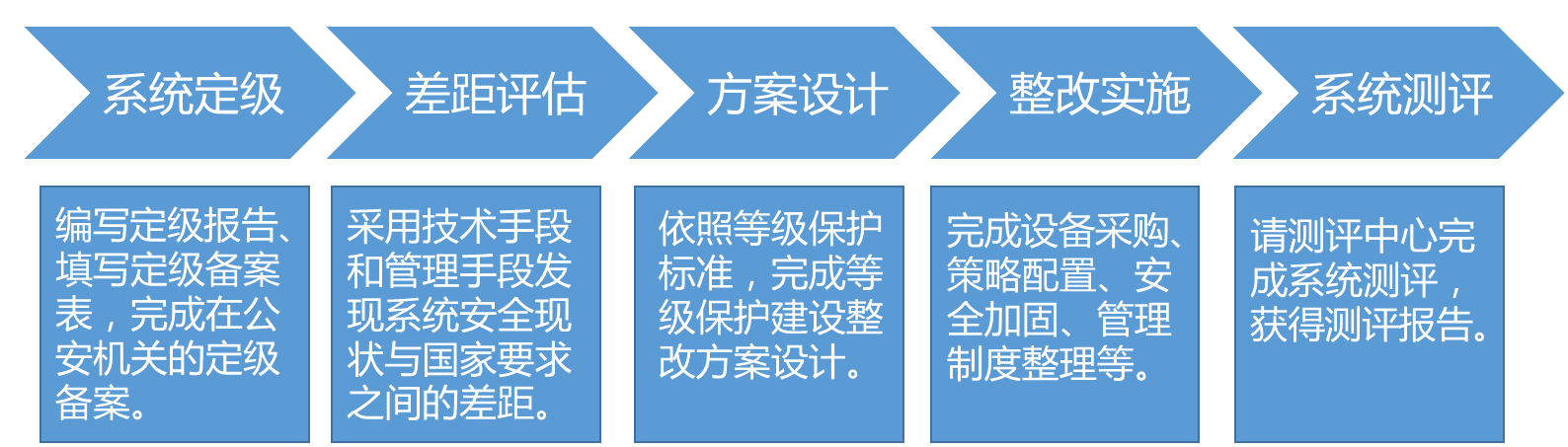 安全咨询服务帮助用户全面满足等级保护合规要求,帮助用户通过等级保护测评,主要包括系统定级、差距评估、方案涉及、整改实施、系统测评五个阶段: