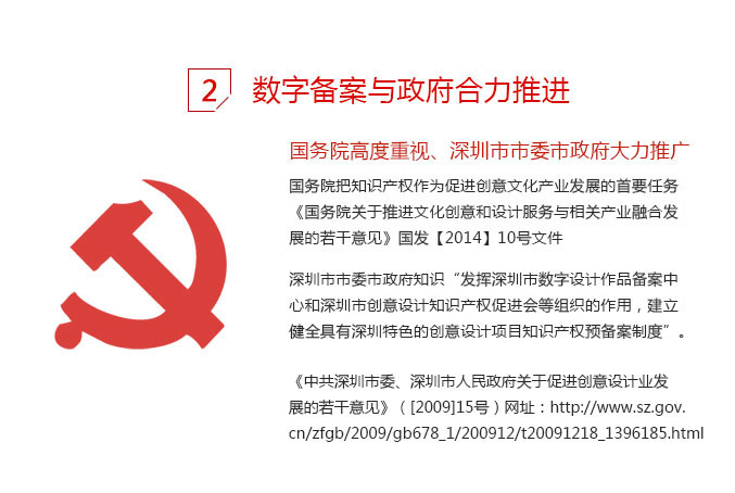 深圳数字作品备案中心是深圳市市委市政府在《中共深圳市委、深圳市人民政府关于促进创意设计业发展的若干意见》( [2009]15号)文件中明确指示:“发挥深圳市数字设计作品备案中心和深圳市创意设计知识产权促进会等组织的作用,建立健全具有深圳特色的创意设计项目知识产权预备案制度”。2012年7月,深圳市市场监督管理局(深圳市知识产权局) 批复同意将“深圳数字设计作品备案中心” 更名为“深圳数字作品备案中心”,由深圳市创意设计知识产权促进会出具证书。
