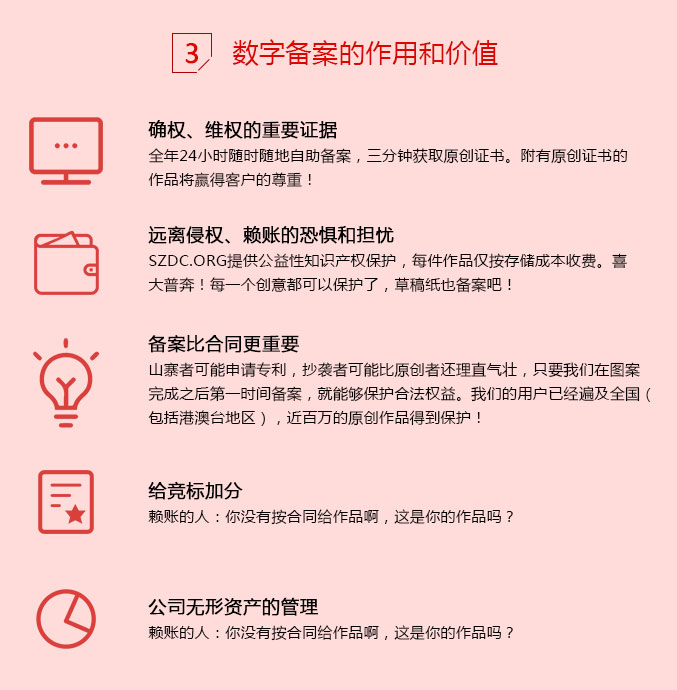 截止2018年6月为止,已超过 700,000+ 主体单位通过数字作品备案中心建立原创保护,备案作品已达1,000,000+, 同时已为20,000+个备案作品提供版权保护等法律服务;