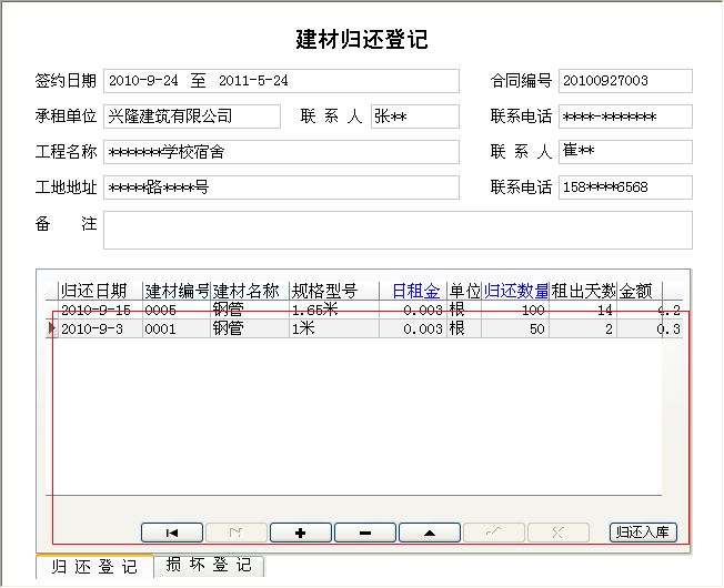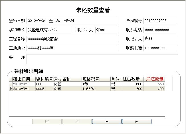 各种材料在客户中的剩余数量分布情况?每天的日租金是多少?各租赁单位的租赁费用是多少?租入和租出的各项明细及汇总数据是什么?哪里有出租数据查询?各租赁单位的材料剩余数量是多少?库存现在还剩多少?如何算账?......又比如像:脚手架、模板、推土机、挖掘机等等周转性材料设备,真是眼花缭乱、让人头疼,使得钢管建材租赁公司的老板经理们操不完的心,费不完的神!怎么办 -----------------如何解决? 请试用《建材租赁管理系统》,一定很好地处理矛盾! 《建材租赁管理系统》主要是针对建材材料租赁行业开发的一款管理软件。系统具体包含了基本资料、租赁管理、库存管理和财务管理细四大模块,界面简洁、菜单功能一目了然,只要您用鼠标轻松一点,即可查询库存、未还等情况、统计租金、欠款等情况等,方便建筑材料租赁统计分析,获取策。本管理系统多处具有快速辅助录入功能,操作简单,易学、易用;处理功能高效强大,是协助建筑材料租赁行业的好帮手! 《建材租赁管理系统》主要框架如下: 基本资料:建材信息、建材损坏收费标准、客户资料、计量单位、损坏类型; 租赁管理:租赁合同、租出登记、归还登记、丢赔管理、未还数量查看、合同结束; 库存管理:初始库存、建材入库、归还入库、修复入库、库存明细、库存查看; 财务管理:客房缴费登记、客户缴费查询、客户缴费统计、租金统计、欠款统计。 此软件具有极强拓展空间,可以根据不同的需求进行调整和修改,网站提供免费的下载试用。我们的服务理念是:专业、及时、真诚。如有任何问题欢迎联系我们:联系电话:0635-8386265(销售部)0635-8386255-816(技术部)。 |