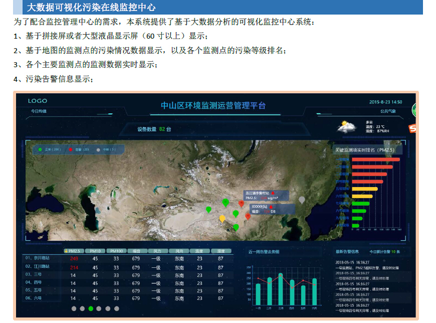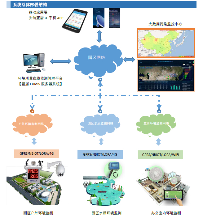 本系统主要构成部分包括:大气监测微、水质监测站、生产排放监测站、数据传输、视频监控(选配)、空气质量在线监测管理平台(软件)、移动管理APP(软件)以及大数据可视化监测管理中心(软件)几个部分。