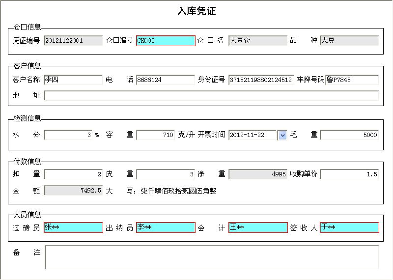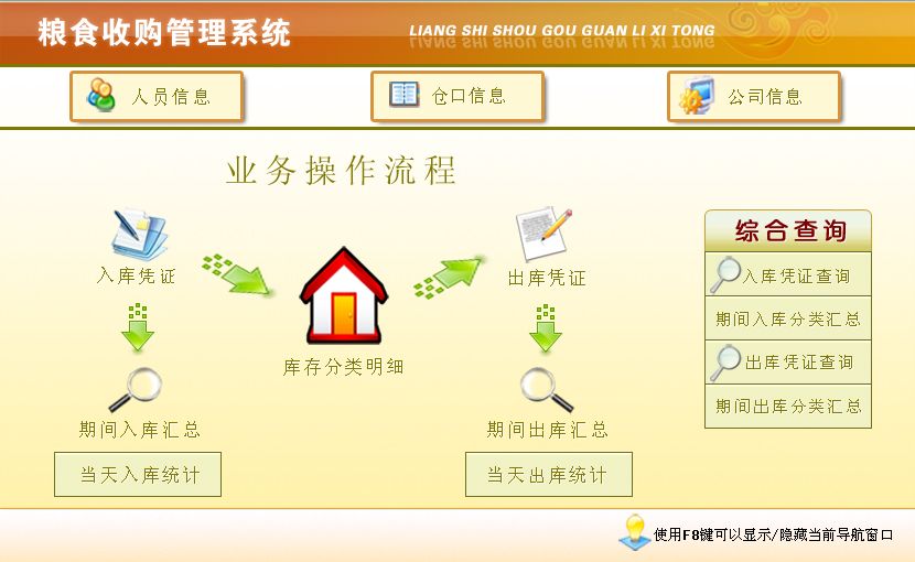《粮食收购管理系统》是针对中小型粮食收购站而开发的一套管理系统软件,可以更方便的录入、查询粮食信息。系统界面简洁,菜单功能一目了然,集基本信息,出入库信息、查询于一体。该系统在功能上主要包括了: 1.基本信息:人员信息、仓口信息、公司信息; 2.入库管理:入库凭证、期间入库汇总、当天入库统计; 3.出库管理:出库凭证、期间出库汇总、当天出库统计。 |