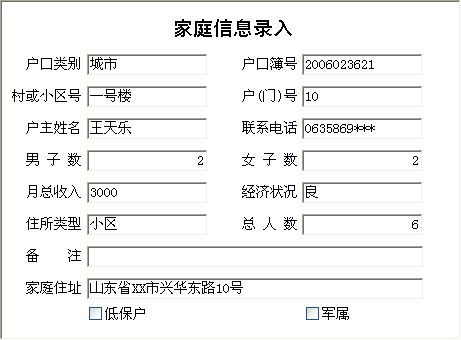 本系统在功能方便主要包括:基本信息(家庭户口薄、基本信息、居民通讯录);社区救助(低保人员、失业人员、优抚对象、老年人信息、残疾人信息、两老人员);查询分析(按户号进行查询、按民族进行查询、低保人员查询、失业人员查询、优抚人员查询、老年人员查询、两劳人员查询、残疾人员查询、按期间查询新增人员、按政治面貌进行查询、按学历进行查询、按婚姻状况进行查询、组合查询和按户口类别进行查询);统计分析(人员综合统计)以上功能。 |