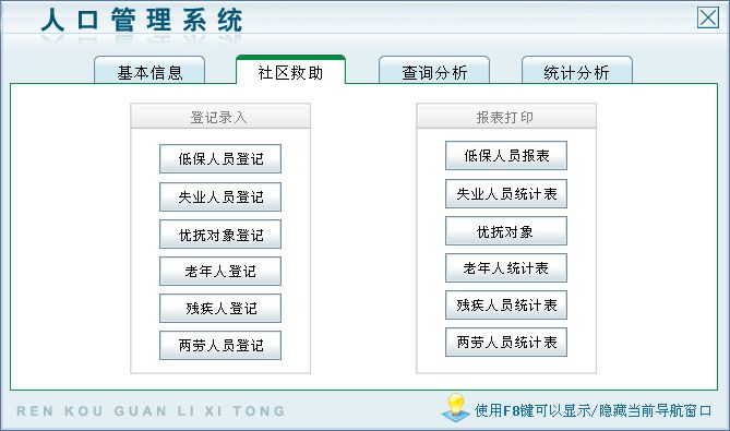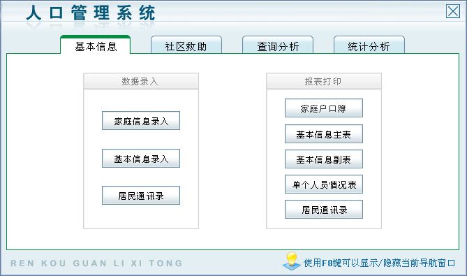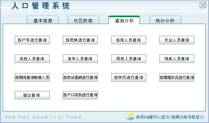 《人口管理系统》是专门为小区,村居,社区开发的一套系统,不仅满足了家庭信息、个人信息及通讯录的输入,输出,存储,添加,删除,还设计了按户号,民族,政治面貌,学历,户口类别及多个、单个人员详细信息等十多项查询,随着中国的发展与政策改革,对于低收入人员,残疾人员,老年人及失业人员的优抚政策越来越多,对于各个方面的管理存在着一定的冗余性。