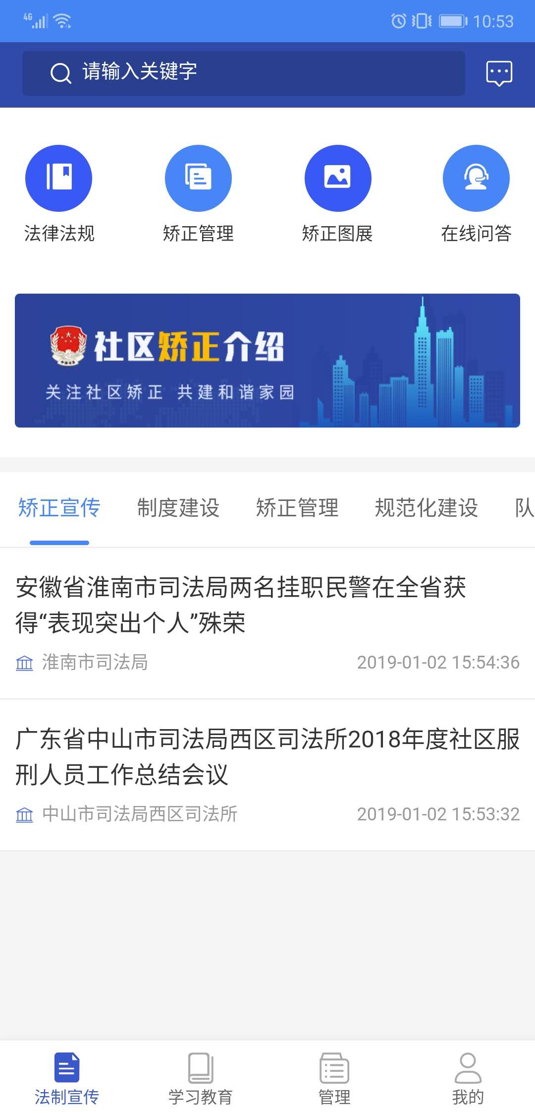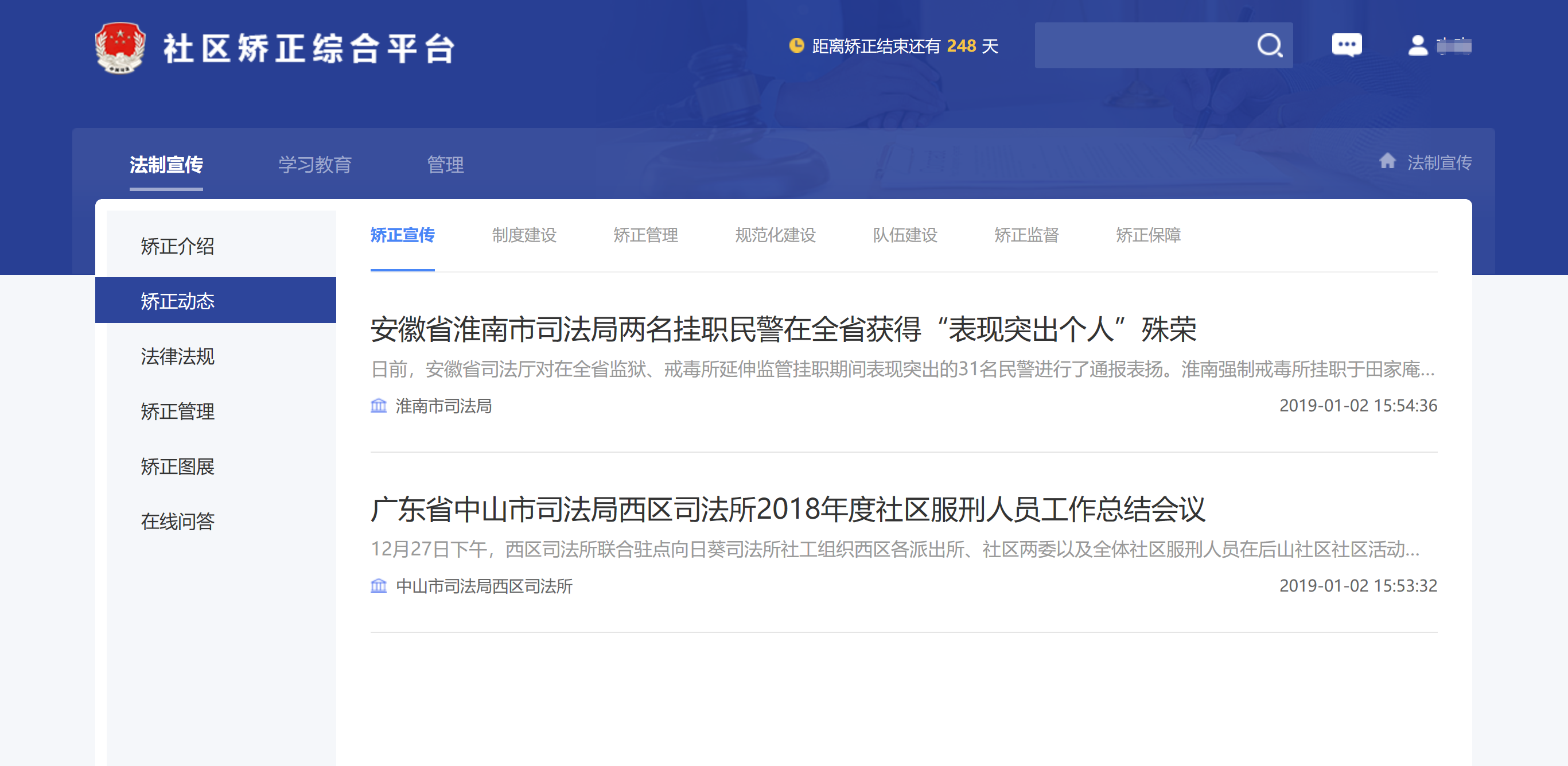 • 矫正动态、法律法规、矫正管理专栏:产品中包含预置栏目,栏目内容可由组织自行管理,也可以通过运营服务由 平台统一提供。