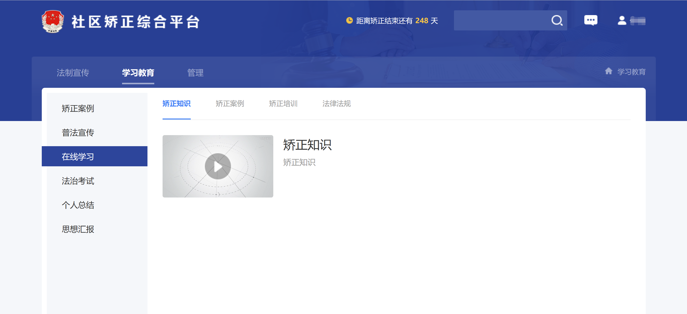 • 视频学习:矫正人员直接在手机上可以进行矫正知识、矫正培训、矫正案列、法制法规等视频专题学习。